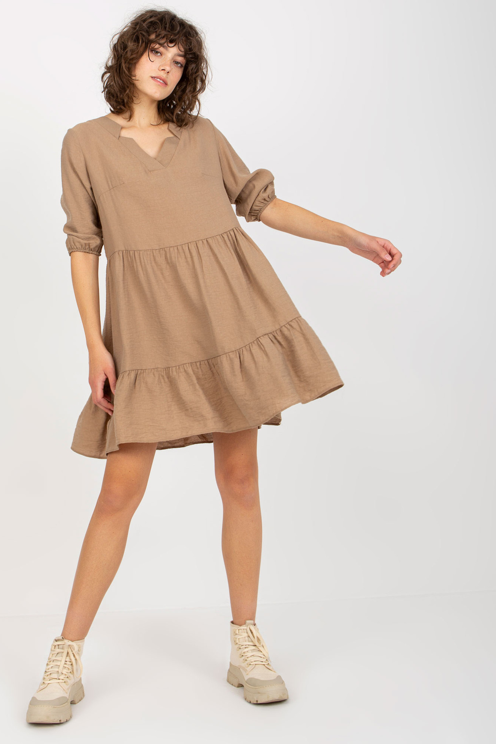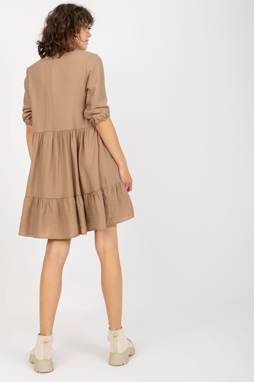 Tamsiai smėlio spalvos laisva suknelė su pūkuotėmis ir 3/4 rankovėmis Harly. Prekės kodas: EM-SK-004.06 Dominuojantis raštas: be rašto Stilius: laisvalaikio galimybė: laisvalaikis, miestui, darbui Modelis dėvi S/M dydį. Modelio matmenys: aukštis 177 cm, krūtinė 84 cm,