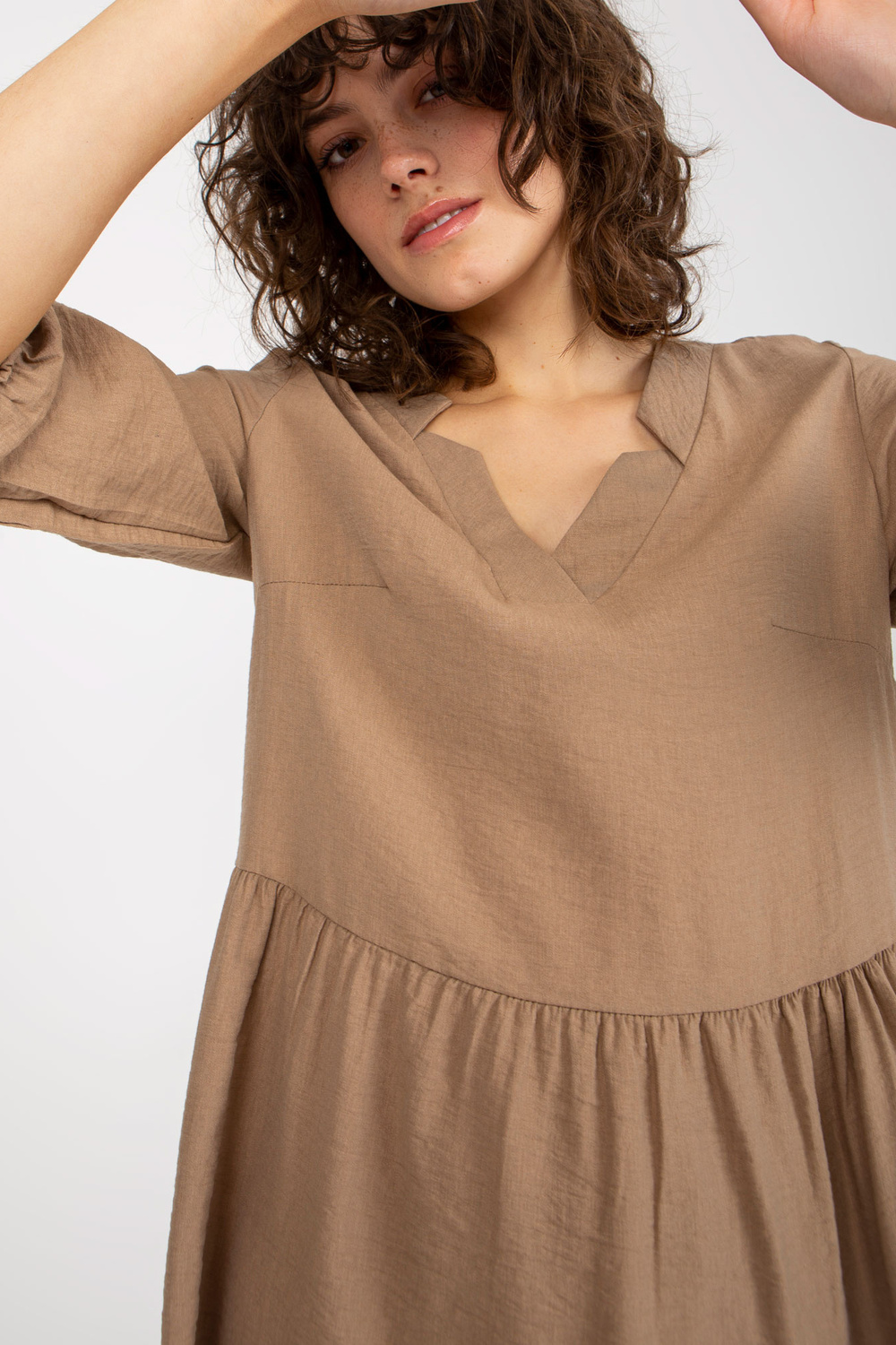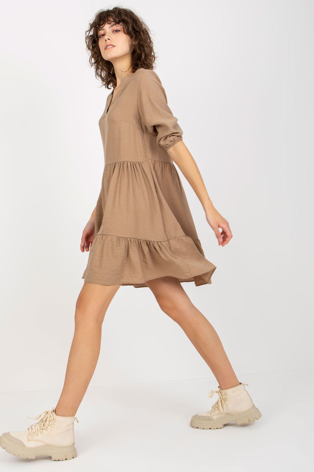 Tamsiai smėlio spalvos laisvi raukiniai 3/4 rankovėmis Harly suknelė