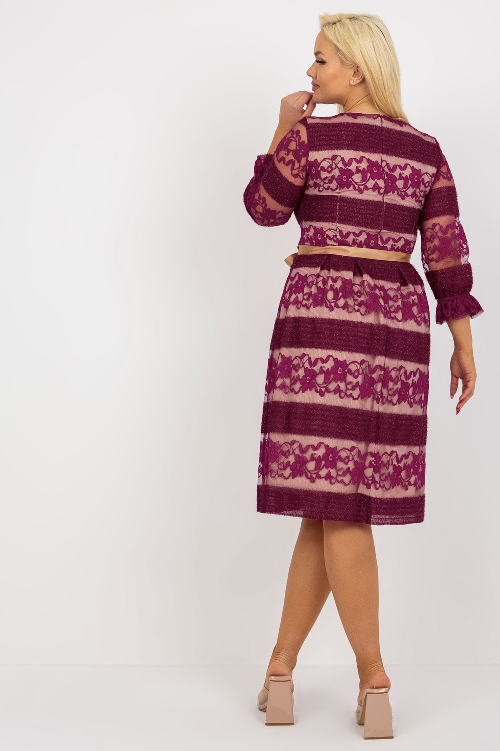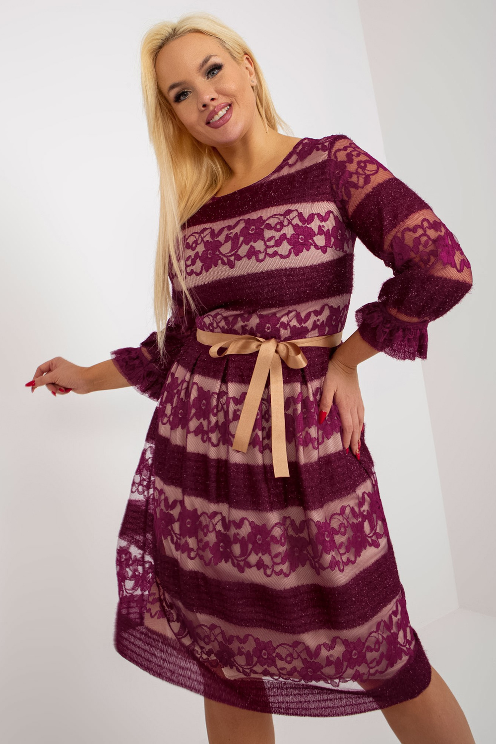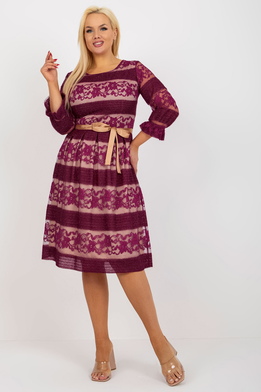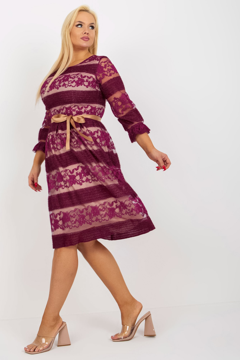 Violetinė plius dydžio kokteilinė suknelė su nėriniais.