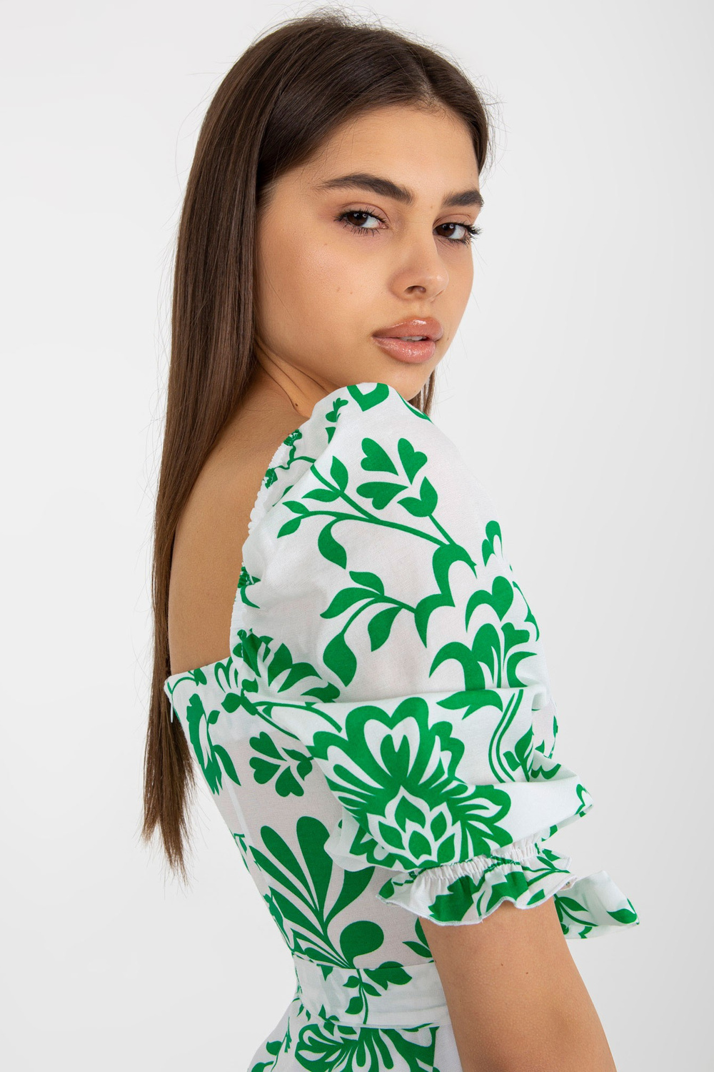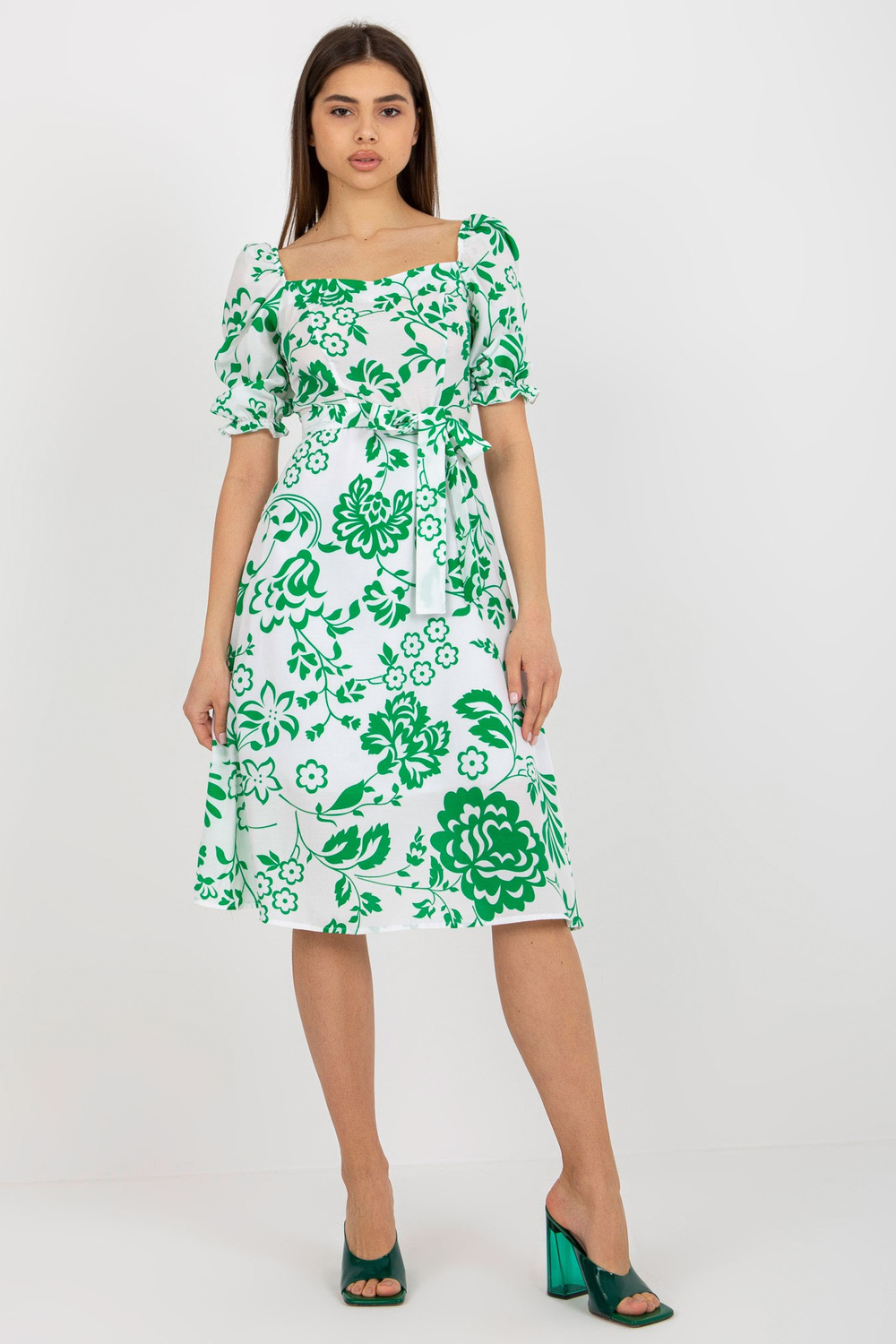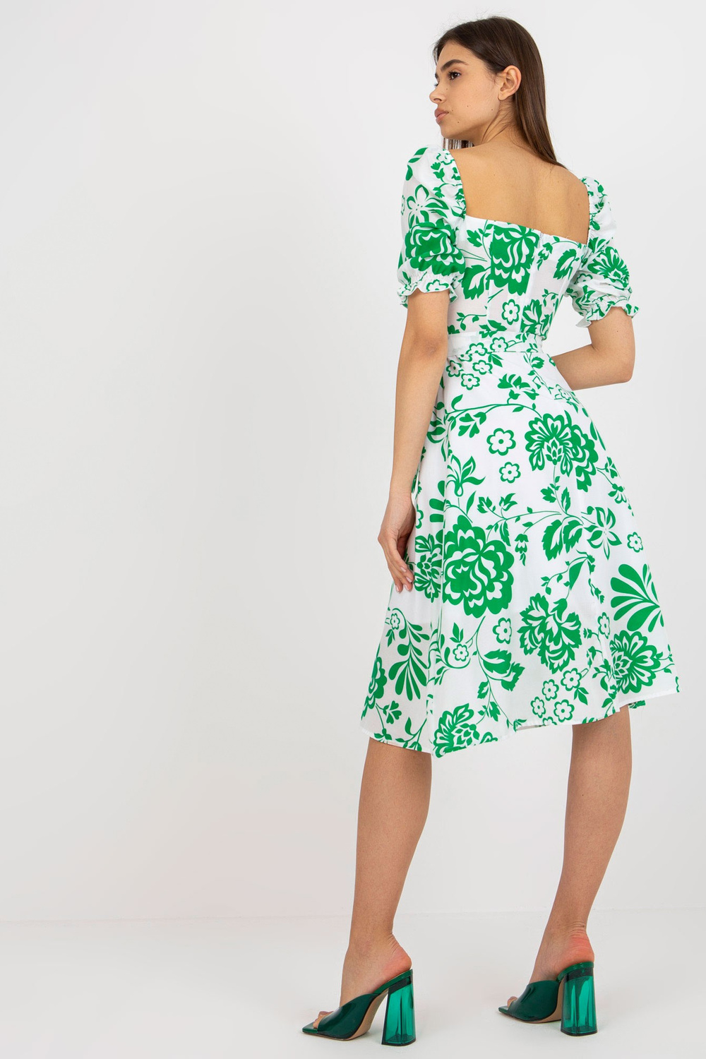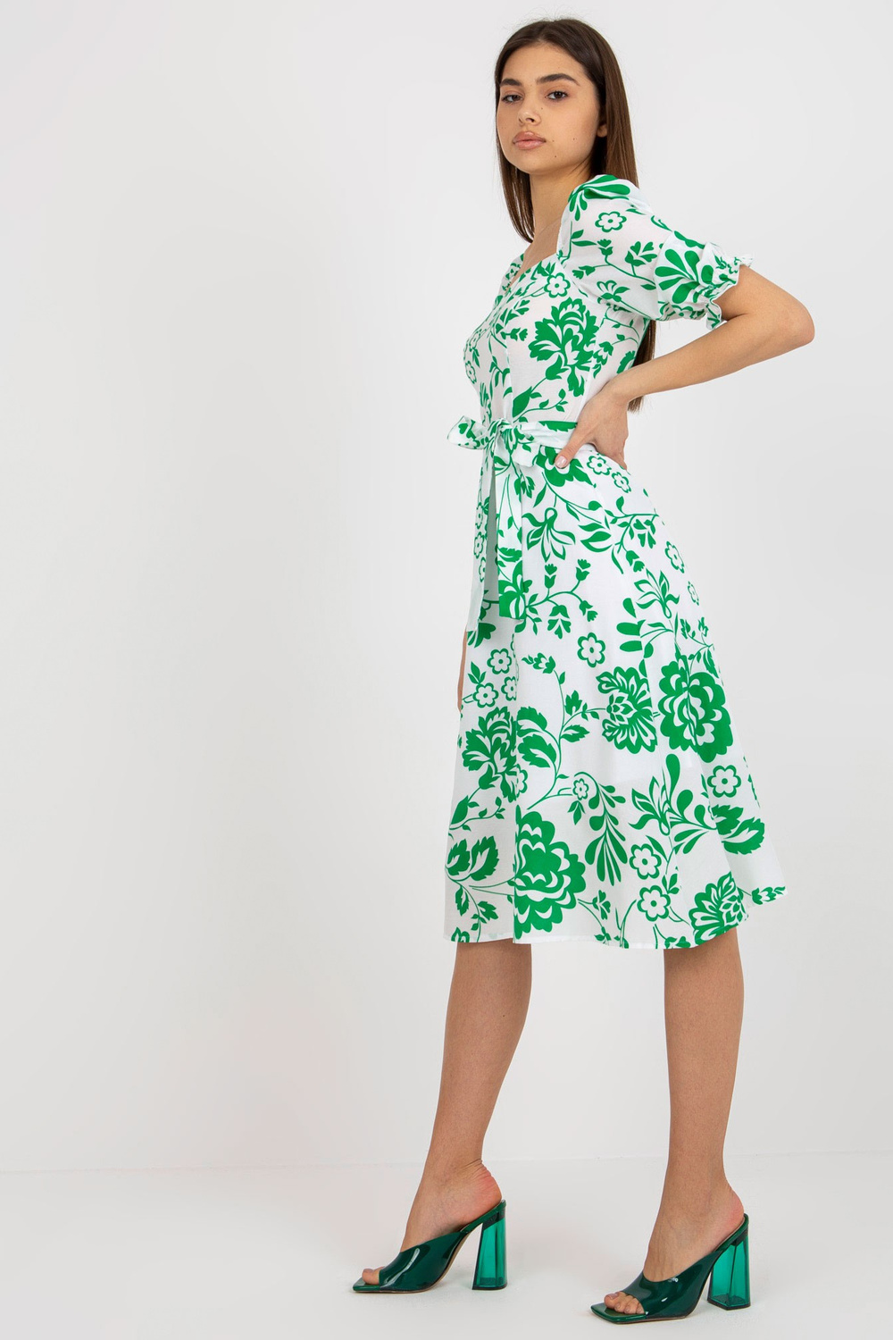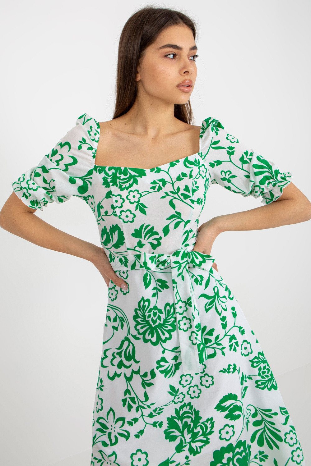 Balta ir žalia midi suknelė su raštu ir trumpomis rankovėmis