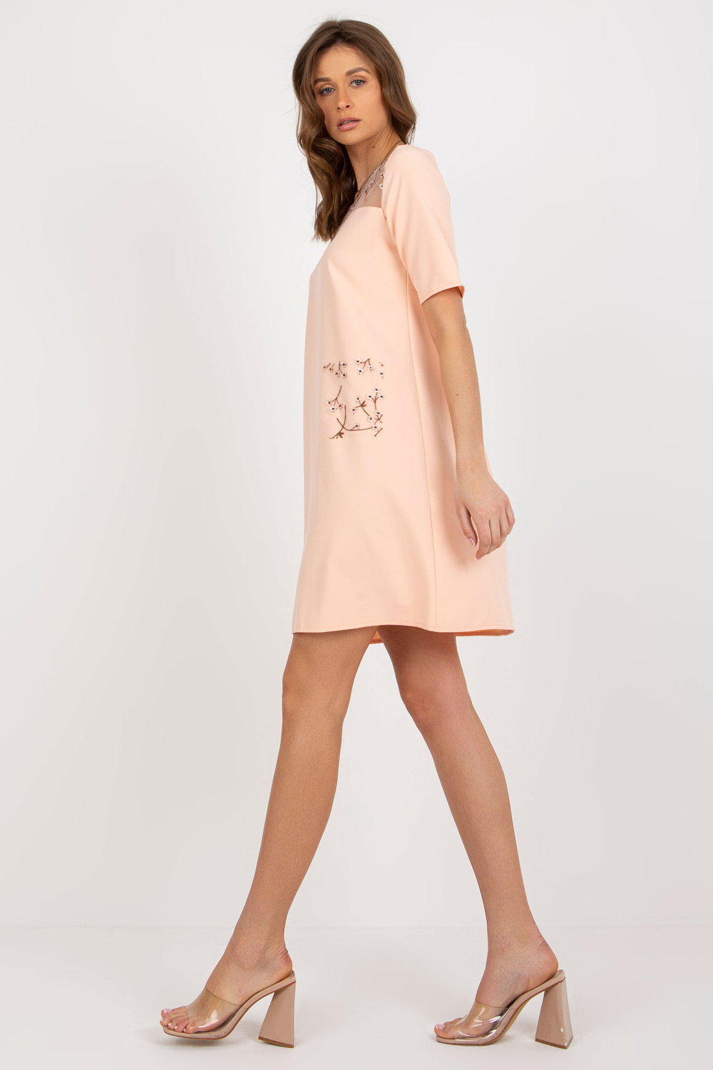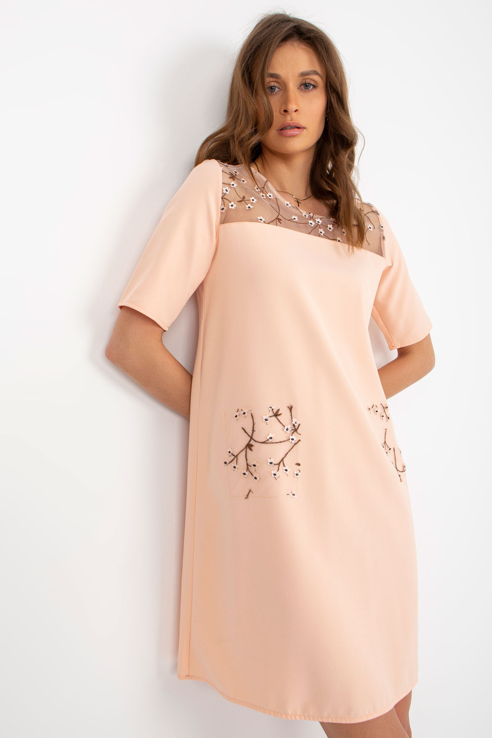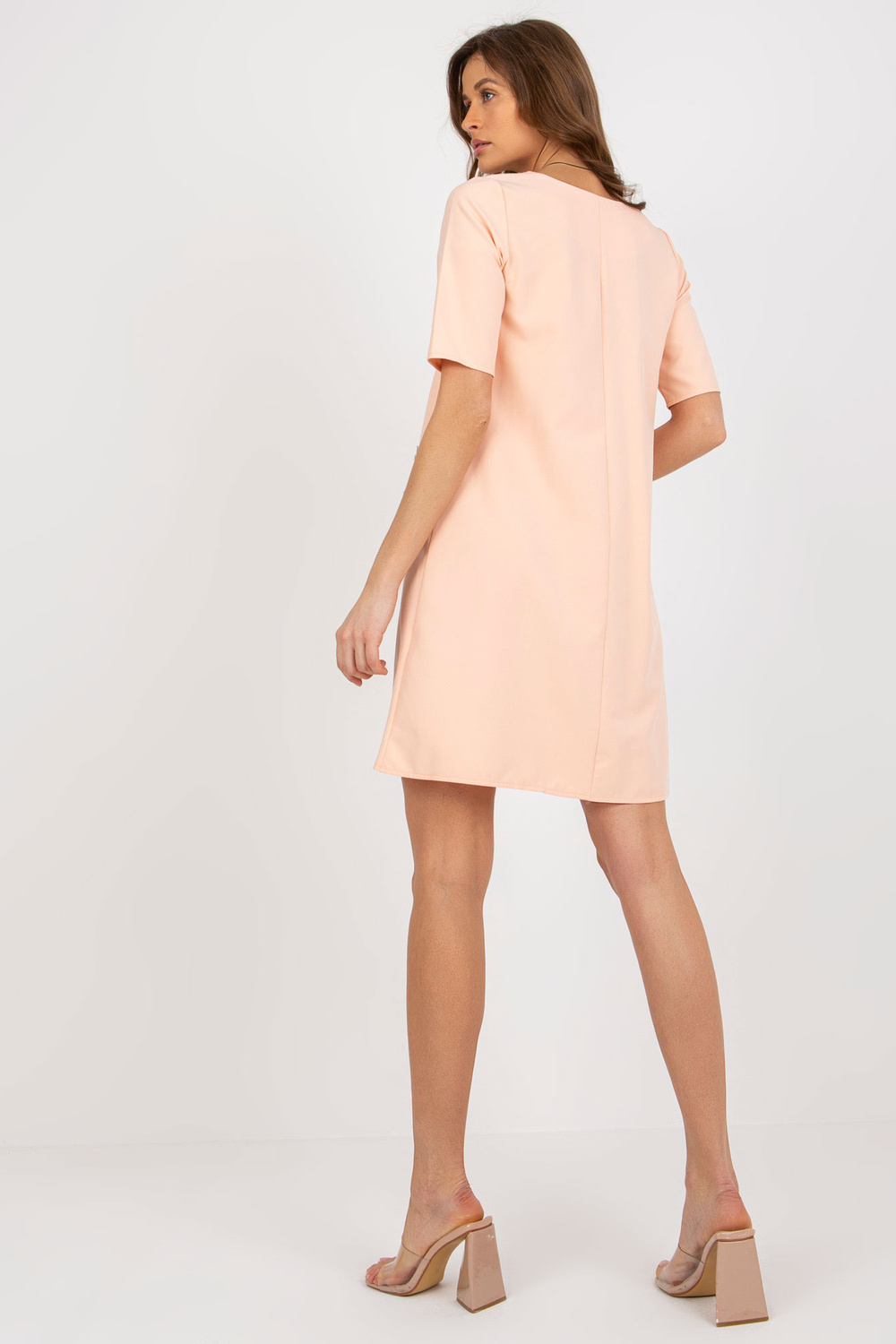Persikinė paprasta kokteilinė suknelė su kišenėmis