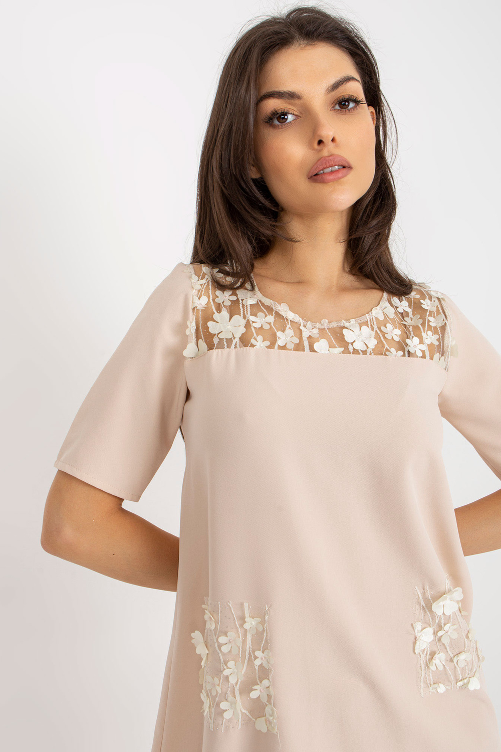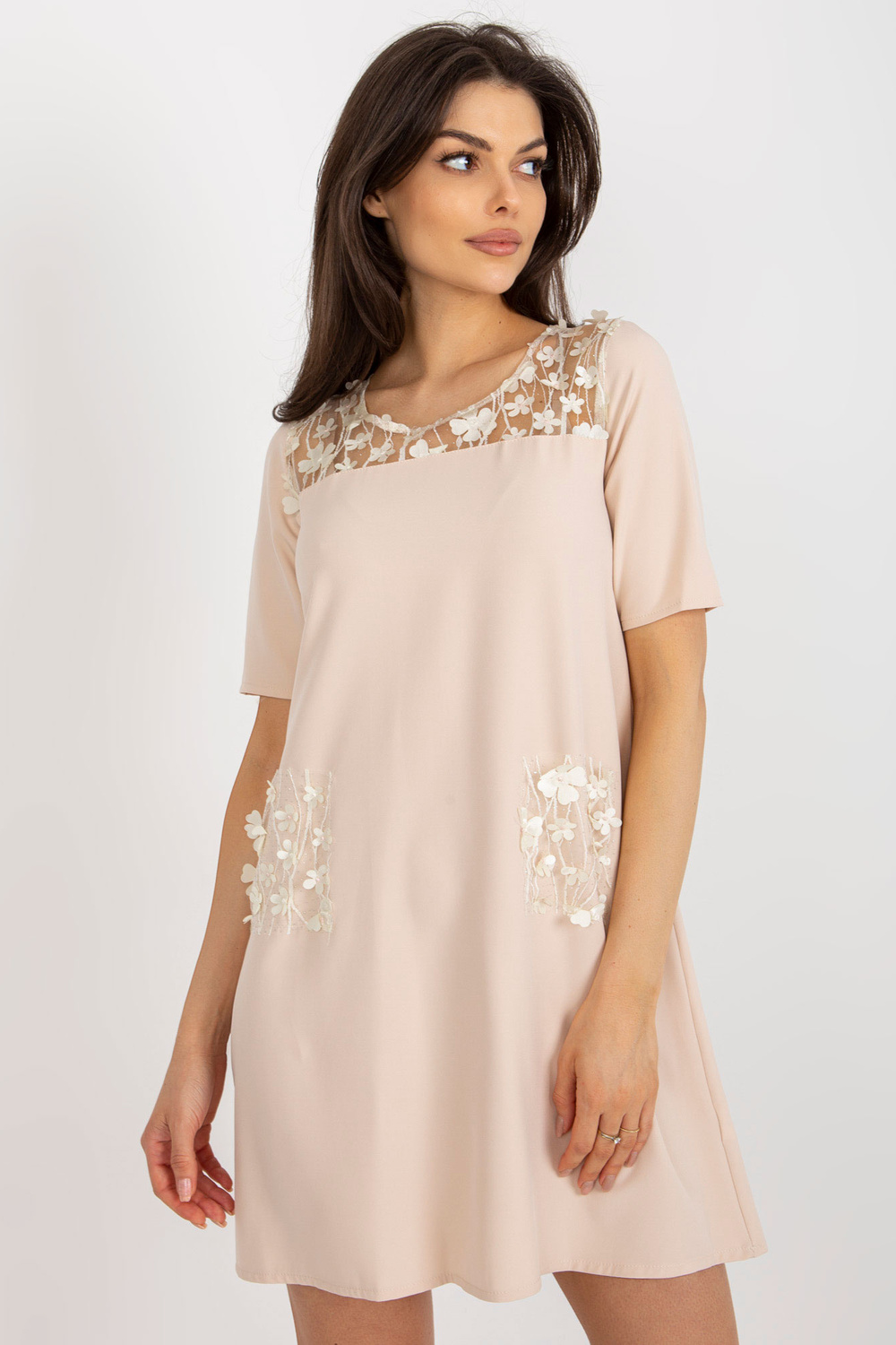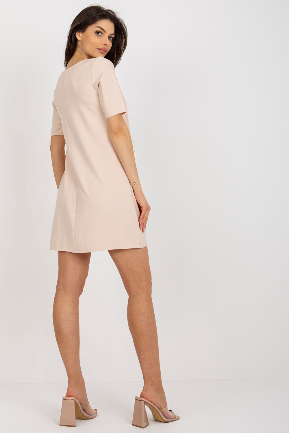 Smėlio spalvos mini kokteilinė suknelė su kišenėmis.