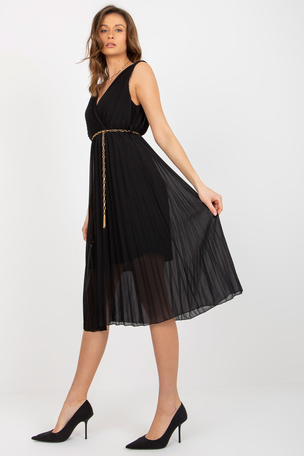 Juoda „midi“ klostuota suknelė su grandinės dirželiu.