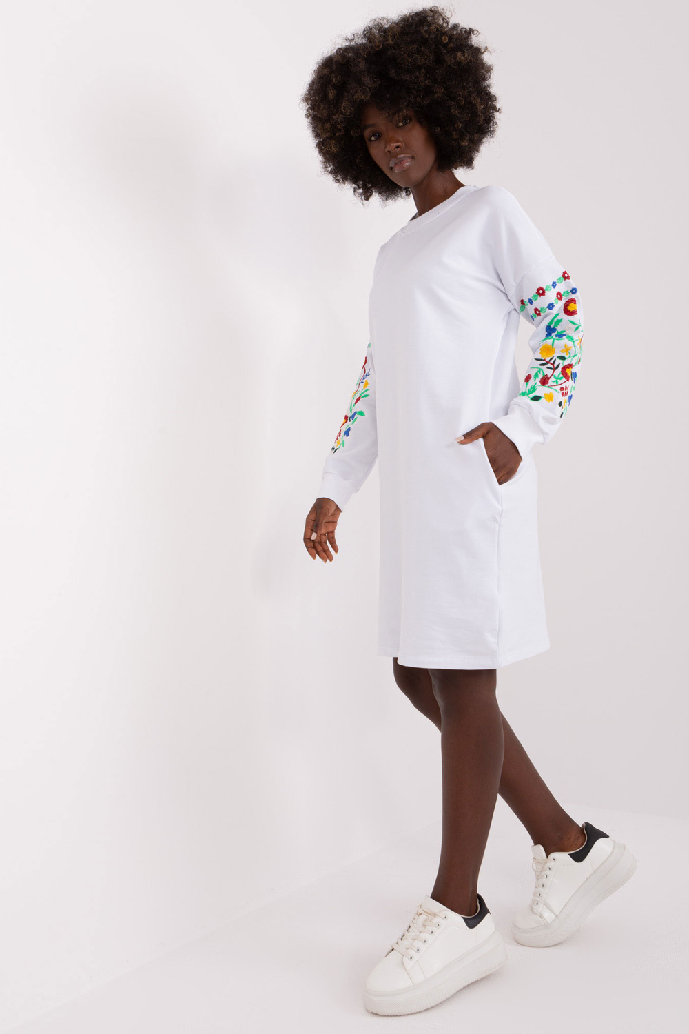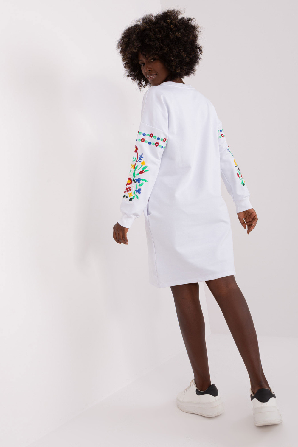 Suknelės matmenys S/M dydžio, matuojamas plokščias: plotis po pažastimis - 56 cm, rankovių ilgis - 62 cm, bendras ilgis - 90 cm.