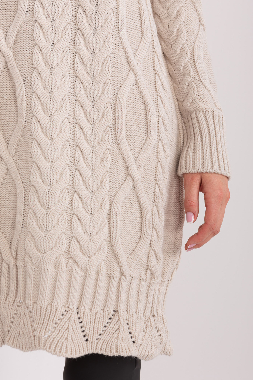 Modelis dėvi vieno dydžio dydį. Modelio išmatavimai: ūgis 176 cm, krūtinė 85 cm, juosmuo 64 cm, klubai 92 cm.
