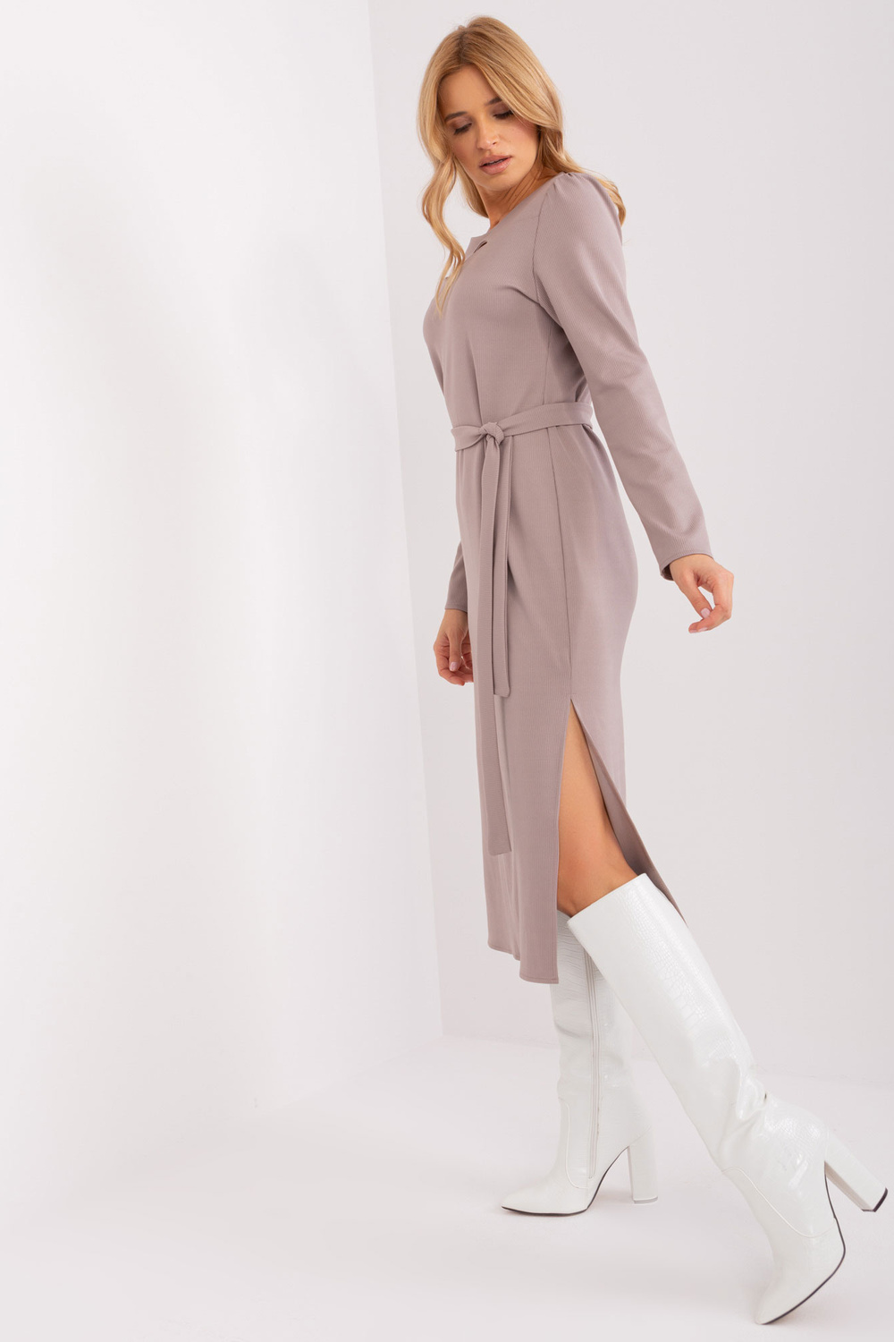 Tamsiai smėlio spalvos kokteilinė suknelė su skeltukais .