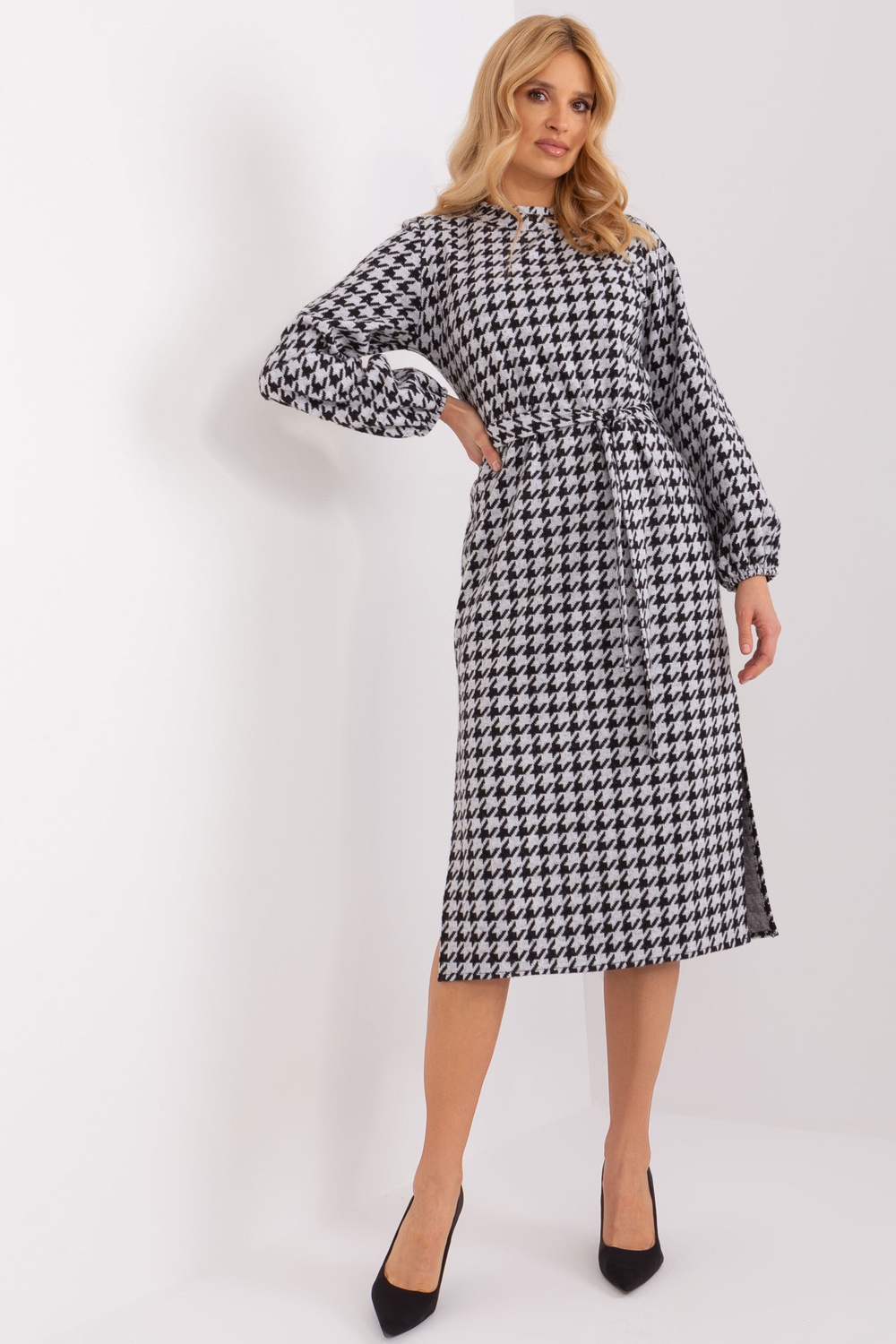 Suknelės matmenys M dydžio, išmatuota plokščia: pažasties plotis - 50 cm, bendras ilgis - 119 cm, rankovių ilgis - 60 cm.