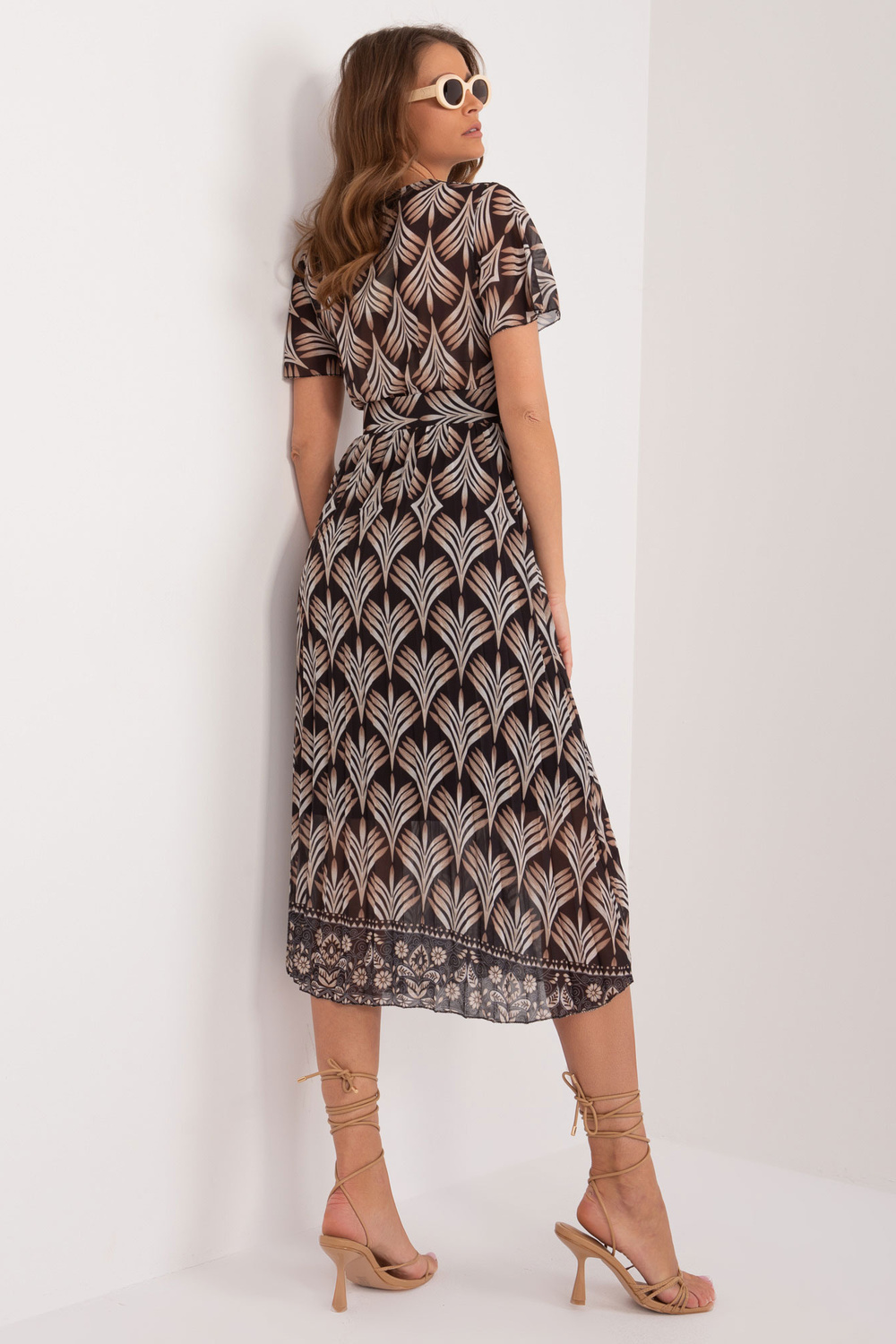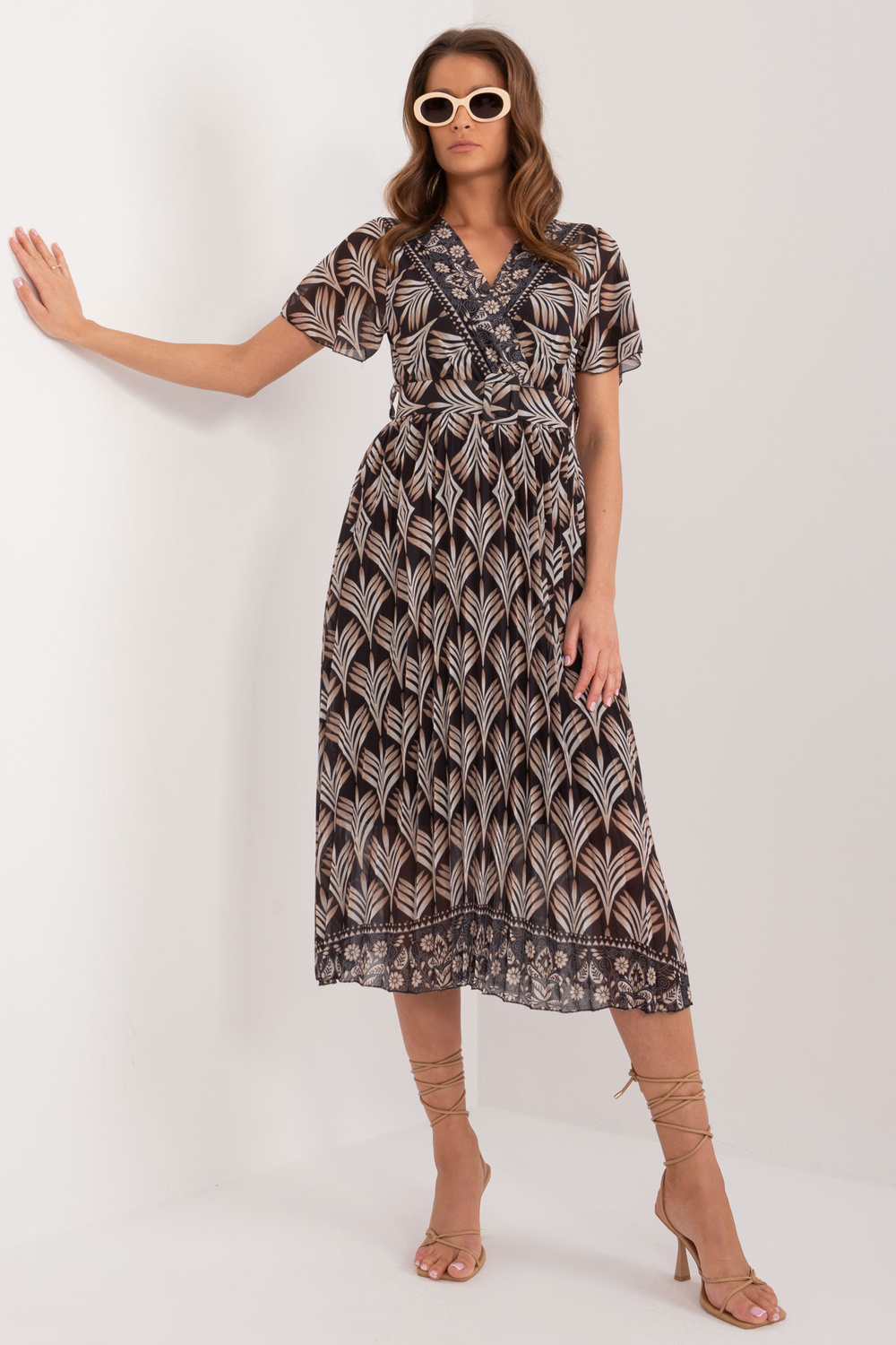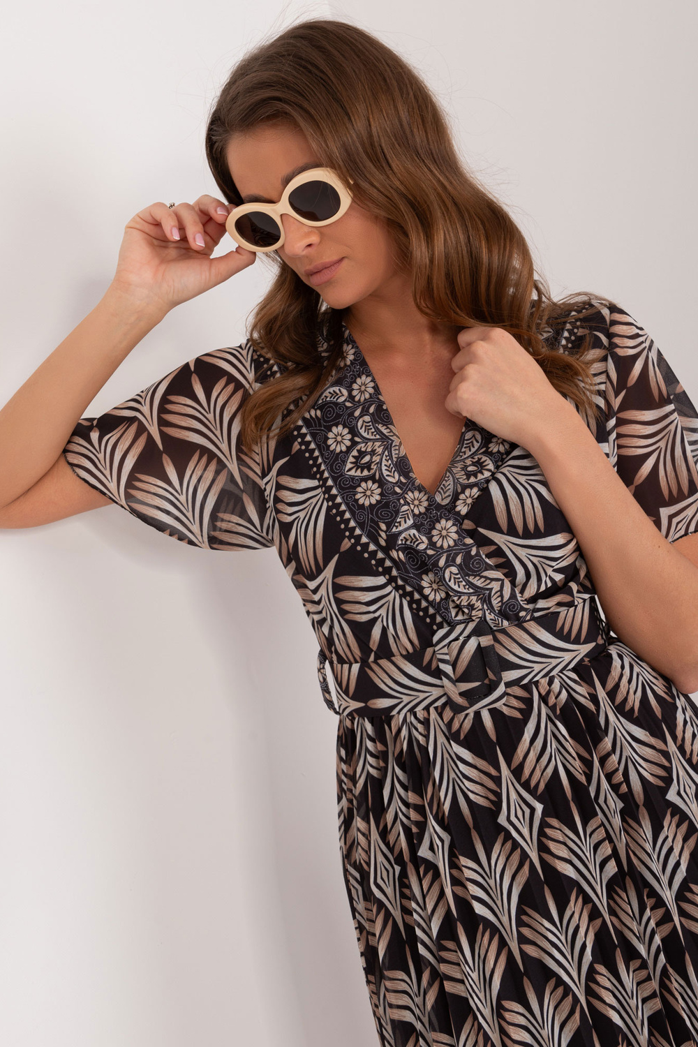Modelis dėvi vieno dydžio dydį. Modelio išmatavimai: ūgis 176 cm, krūtinė 85 cm, juosmuo 64 cm, klubai 92 cm.