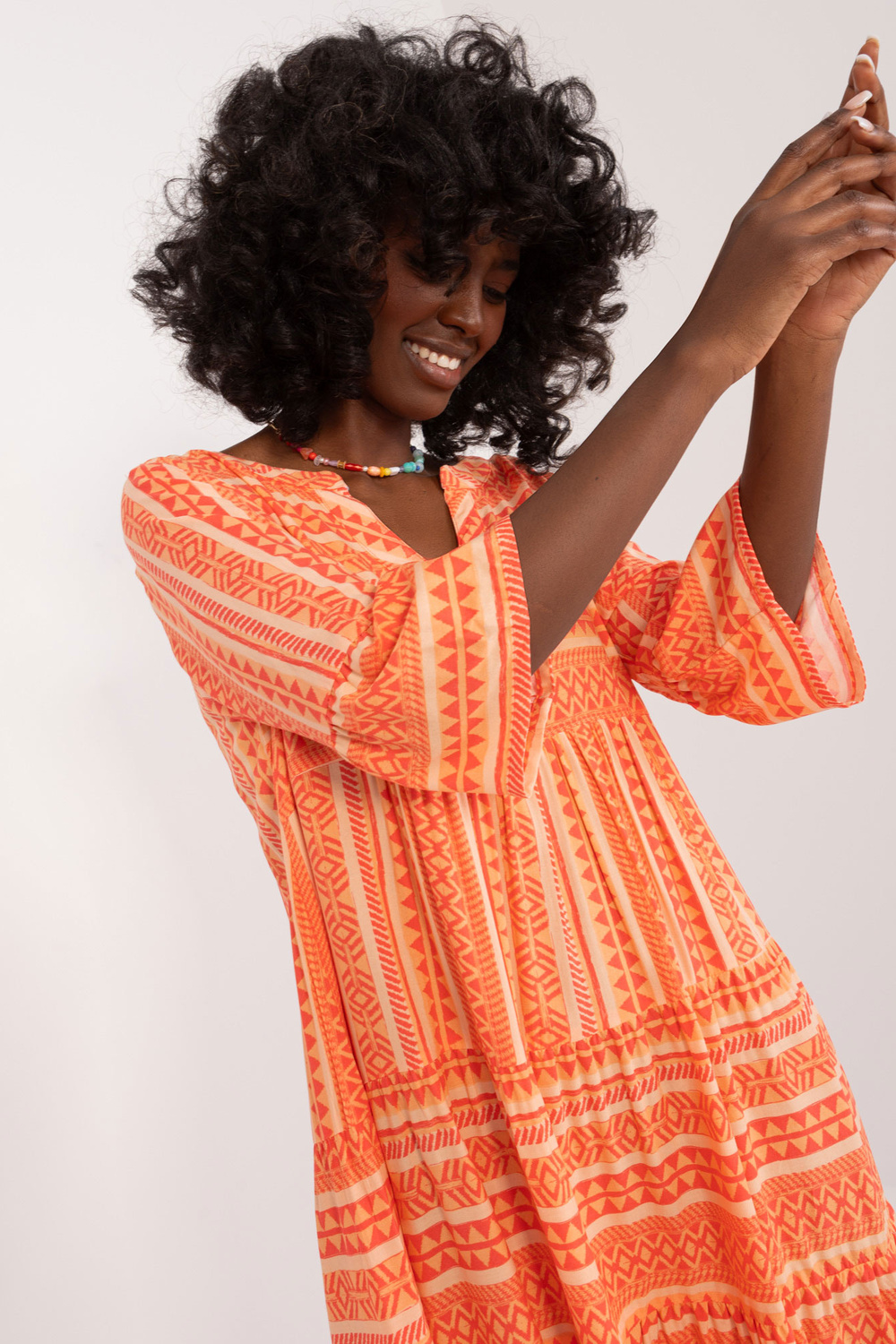Suknelės matmenys S dydžio, matuojamas plokščias: pažasties plotis - 45 cm, rankovių ilgis - 42 cm, bendras ilgis - 94 cm.