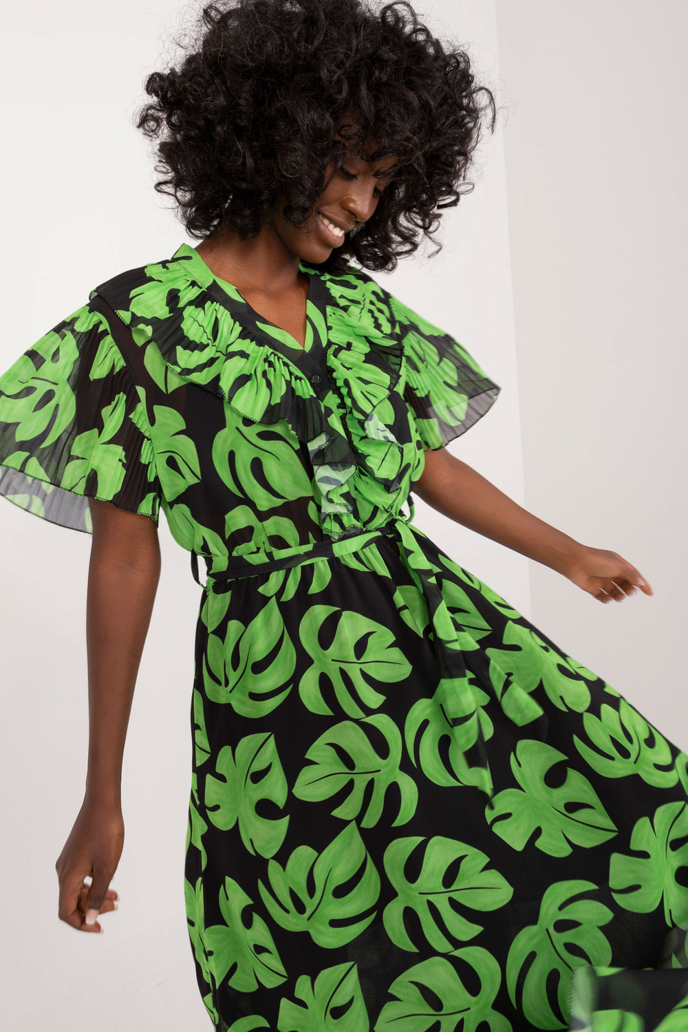 Modelis dėvi vieno dydžio dydį. Modelio išmatavimai: ūgis 168 cm, krūtinė 82 cm, juosmuo 62 cm, klubai 93 cm.