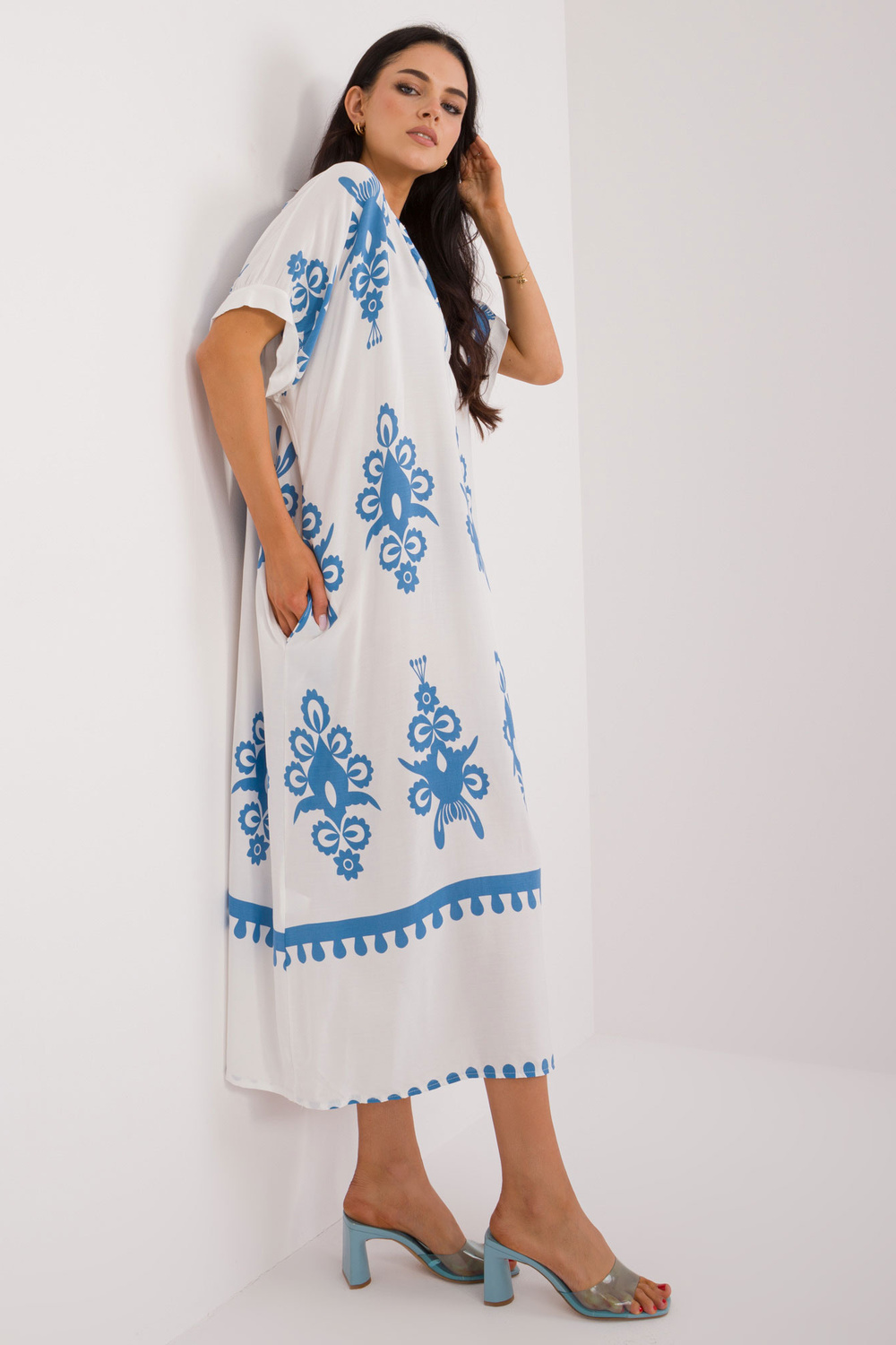Vieno dydžio suknelės matmenys išmatuoti plokščiai: plotis pažastyje - 65 cm, bendras ilgis - 122 cm.