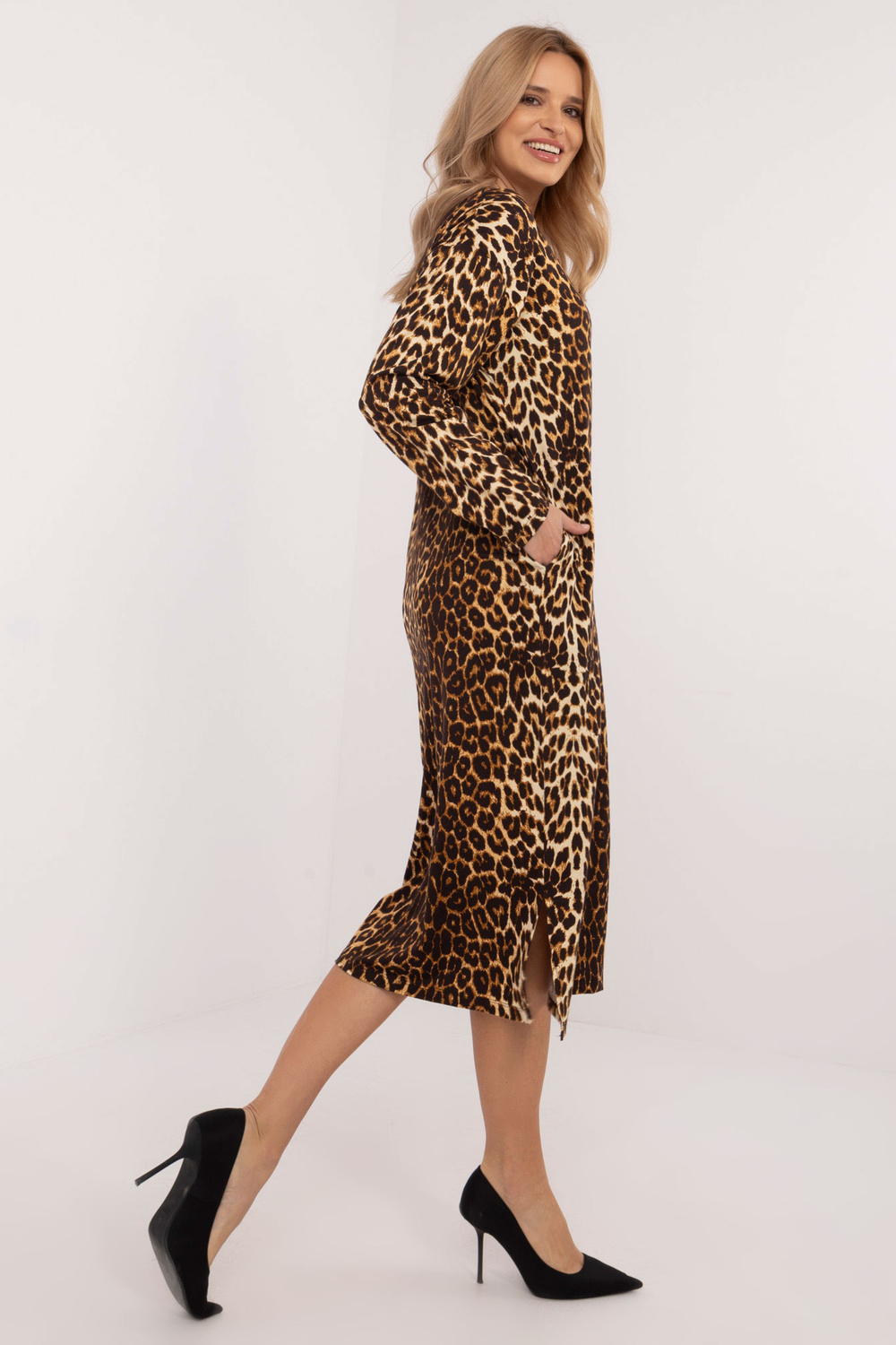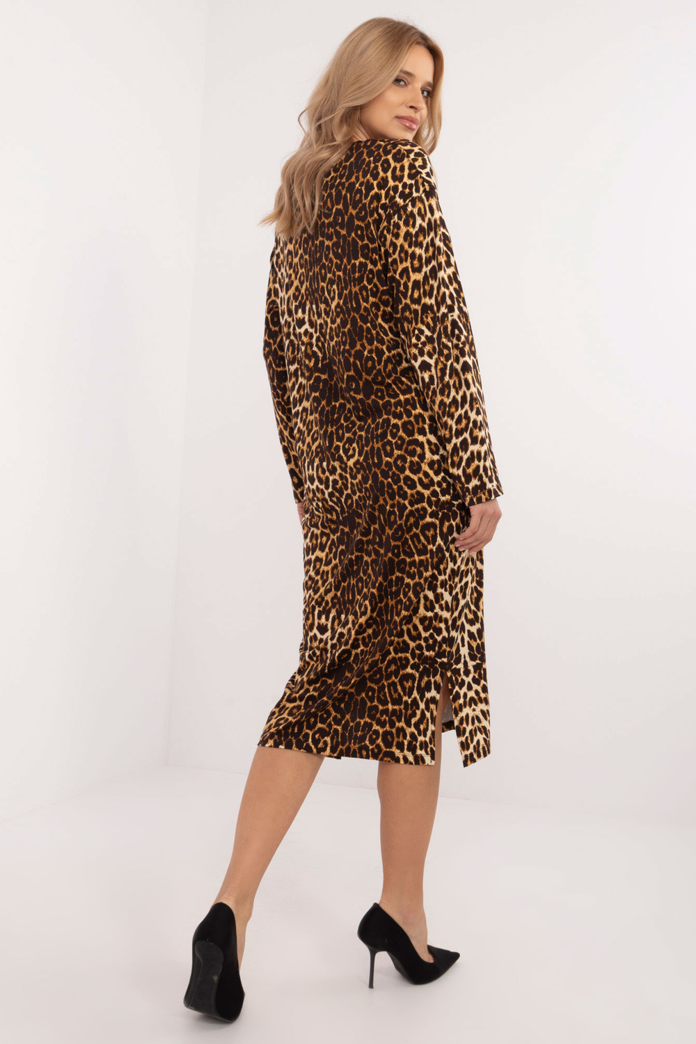 Modelis dėvi vieno dydžio dydį. Modelio išmatavimai: ūgis 175 cm, krūtinė 90 cm, juosmuo 66 cm, klubai 94 cm.