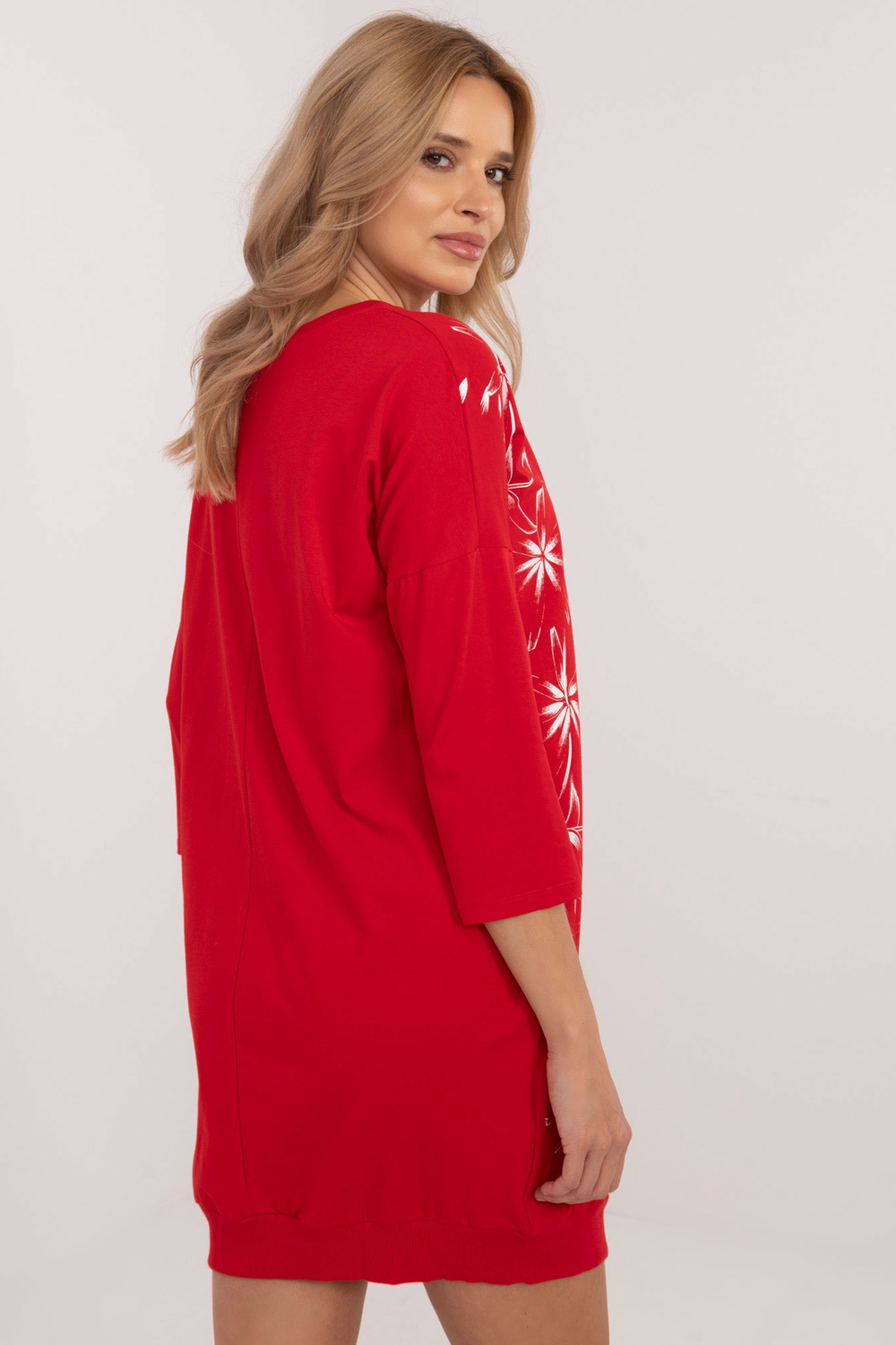 Suknelės matmenys vieno dydžio, matuojamas plokščias: plotis po pažastimis - 58 cm, rankovės ilgis - 30 cm (nuo siūlės), bendras ilgis - 87 cm.