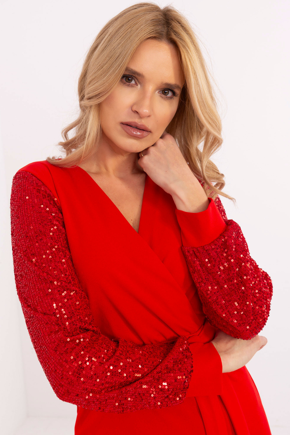 Modelis dėvi vieno dydžio dydį. Modelio išmatavimai: ūgis 175 cm, krūtinė 90 cm, juosmuo 66 cm, klubai 94 cm.