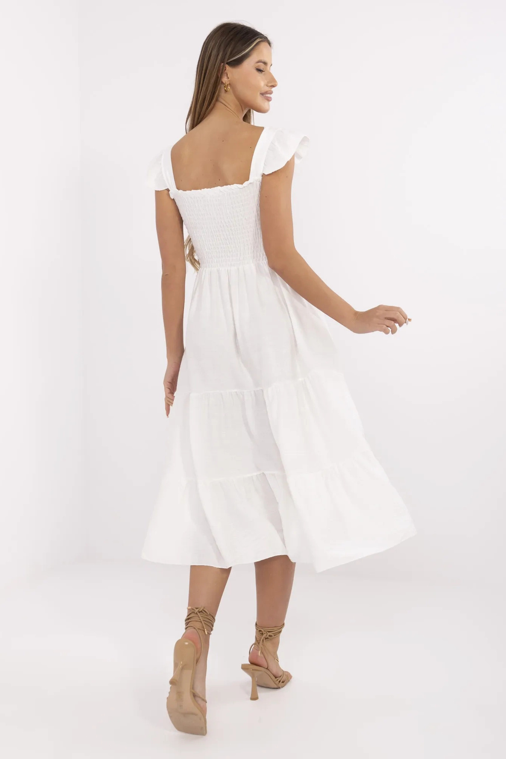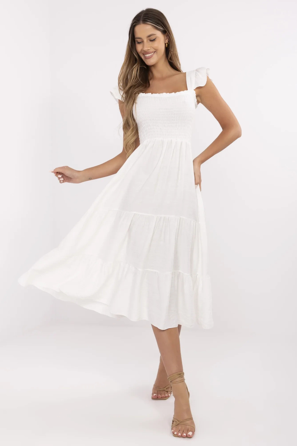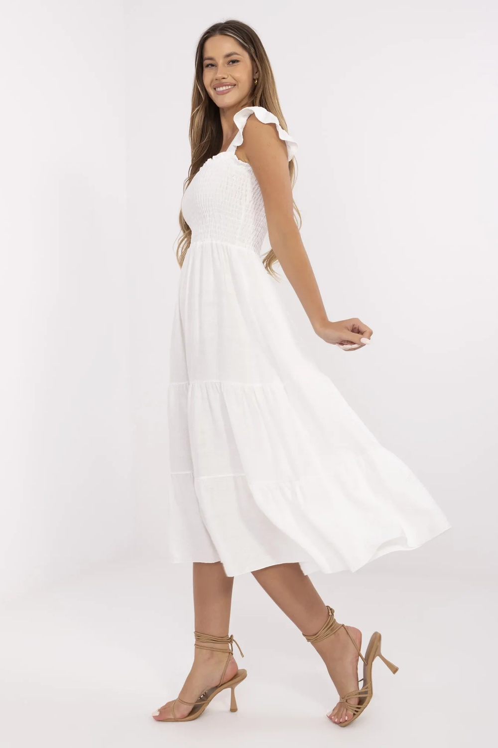 Suknelės išmatavimai vieno dydžio: plotis po pažastimis - 31 cm (ištiesta plokščiai), plotis po pažastimis - 60 cm (po tempimo), juosmens plotis - 29 cm (ištiesta plokščiai), juosmens plotis - 55 cm (po tempimo), klubų plotis - 59 cm, bendras ilgis - 123 cm.
