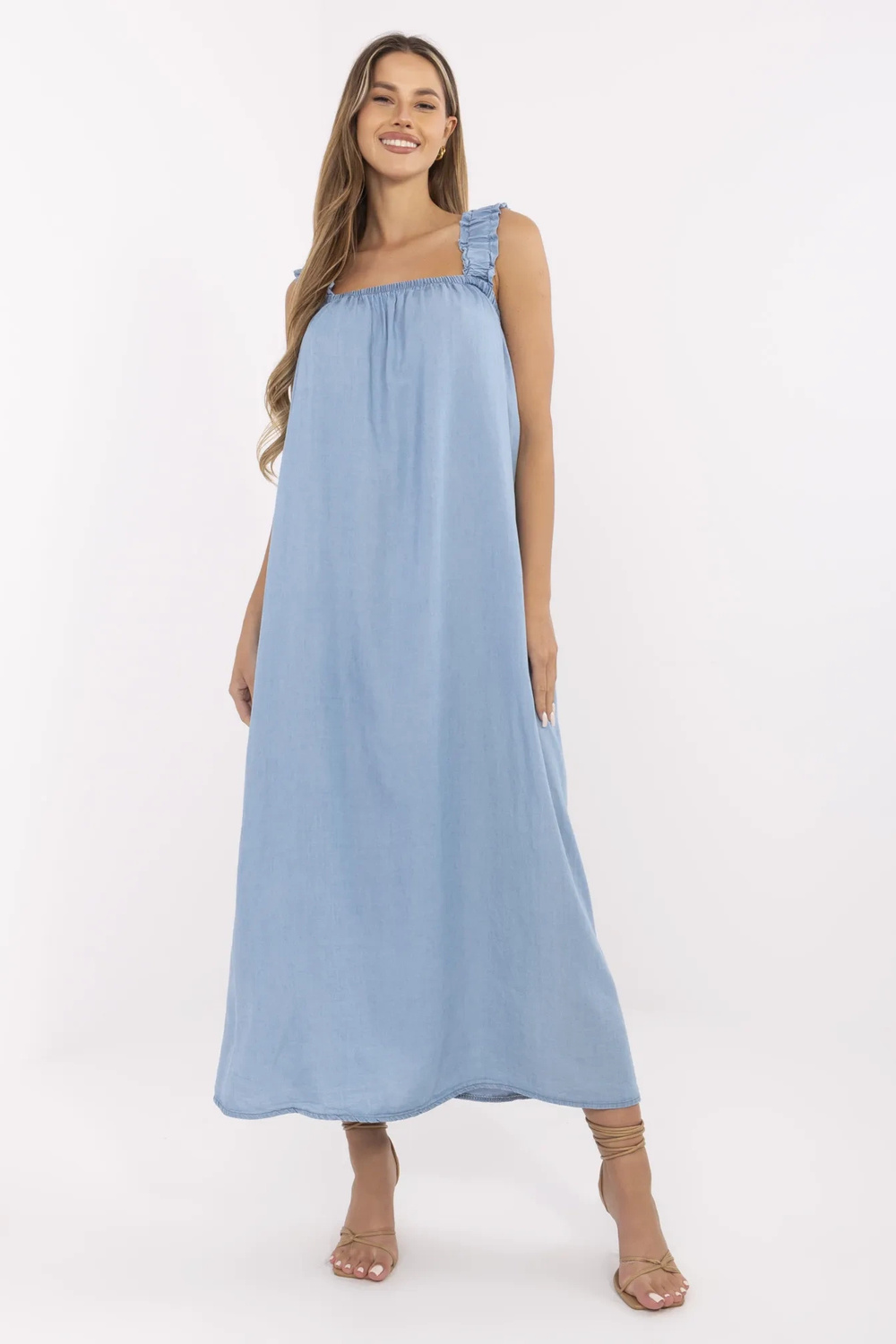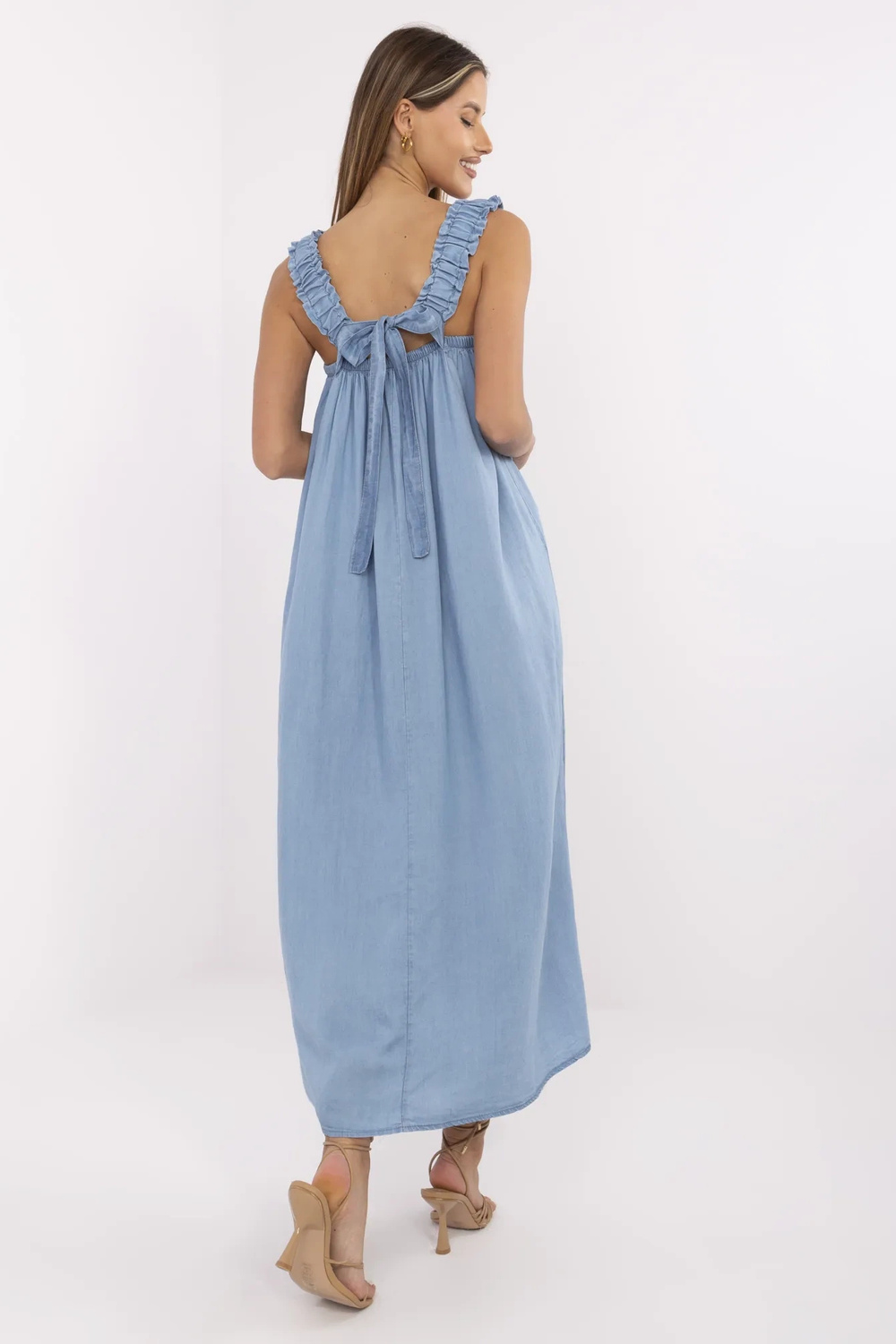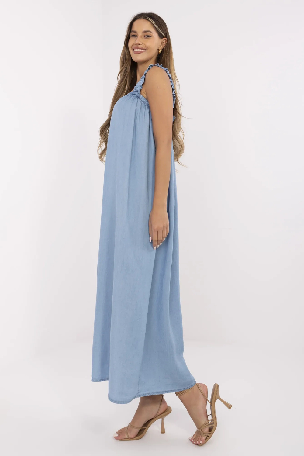 Suknelės išmatavimai vieno dydžio: plotis po pažastimis - 31 cm (be plokščio audinio), plotis po pažastimis - 58 cm (po tempimo), juosmens plotis - 72 cm, klubų plotis - 77 cm, bendras ilgis - 138 cm.
