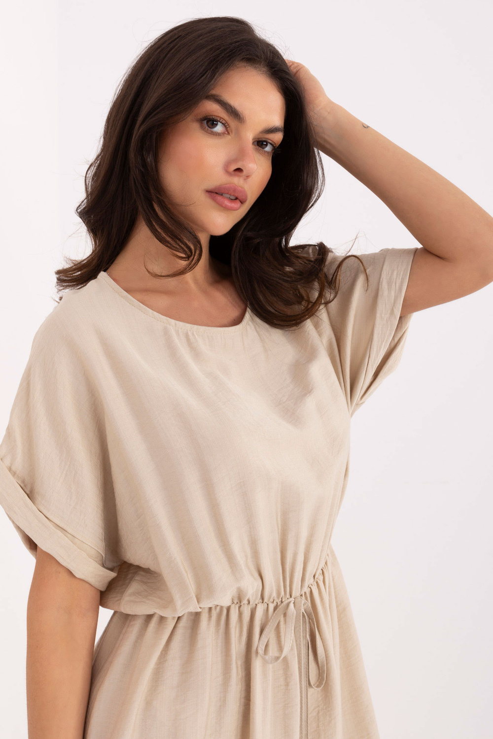 Suknelės išmatavimai vieno dydžio: plotis po pažastimis - 52 cm, juosmens plotis - 33 cm (plokšto liemens), juosmens plotis - 59 cm (po tempimo), rankovių ilgis - 27 cm, klubų plotis - 63 cm, bendras ilgis - 106 cm.