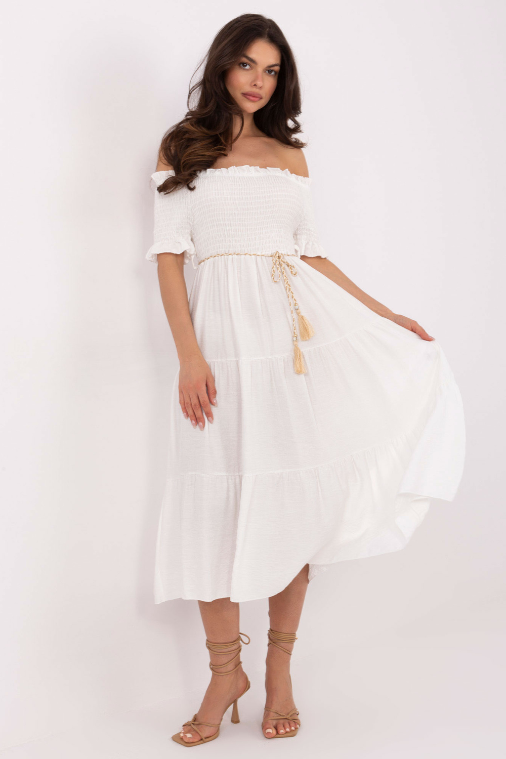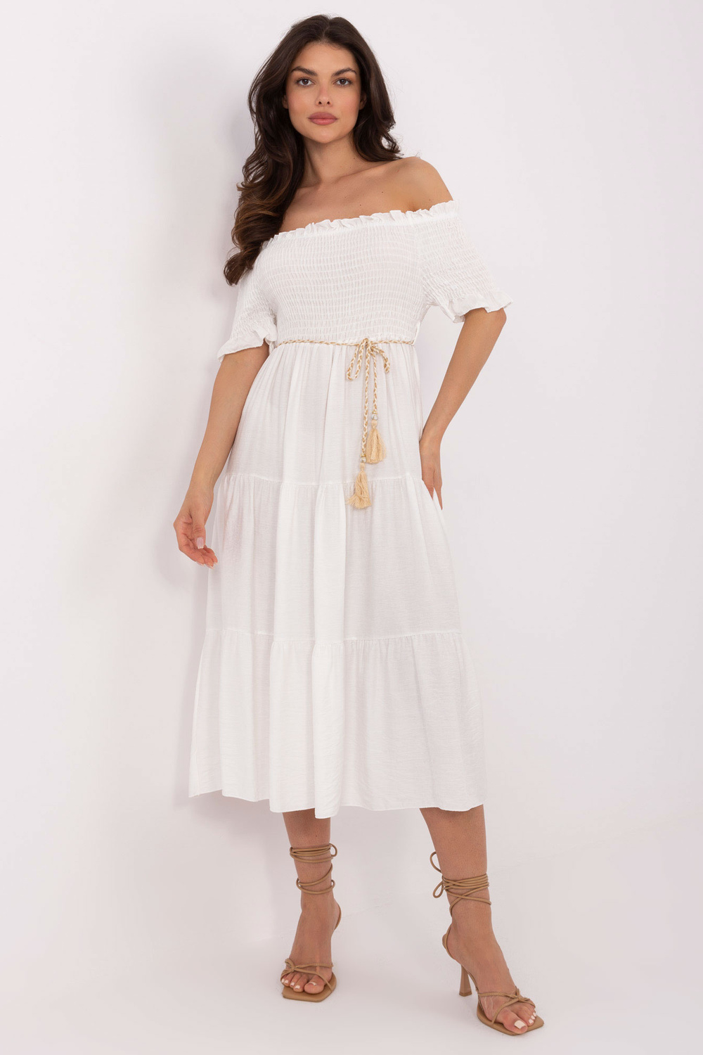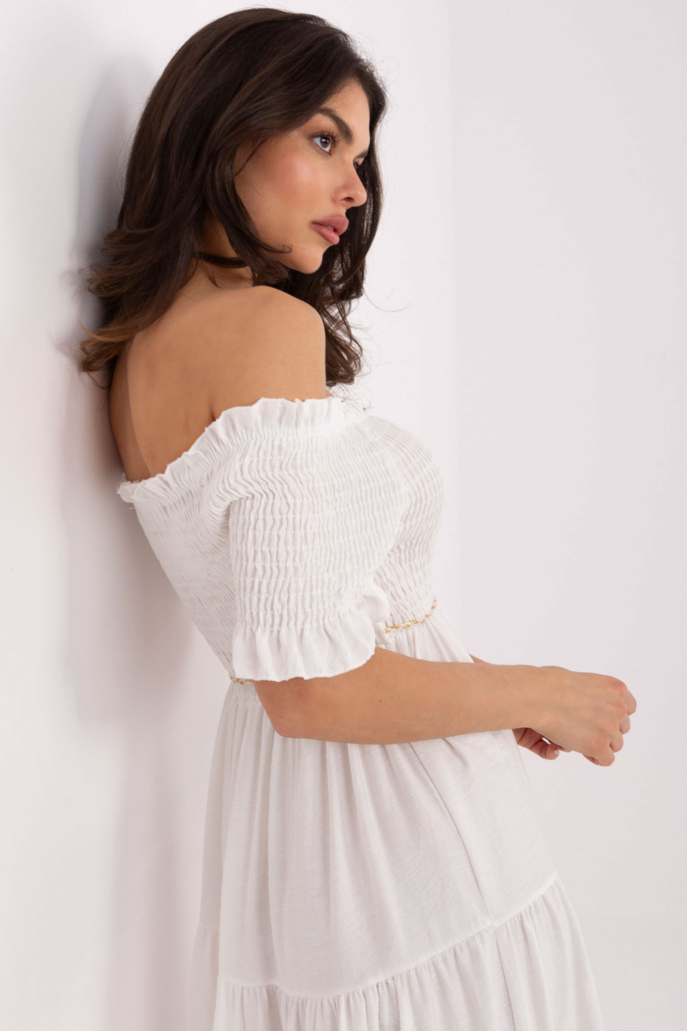 Suknelės išmatavimai vieno dydžio: plotis po pažastimis - 34 cm (ištiesta plokščiai), plotis po pažastimis - 70 cm (po tempimo), juosmens plotis - 33 cm (ištiesta plokščiai), juosmens plotis - 68 cm (po tempimo), klubų plotis - 60 cm, rankovių ilgis - 21 cm, bendras ilgis - 111 cm.