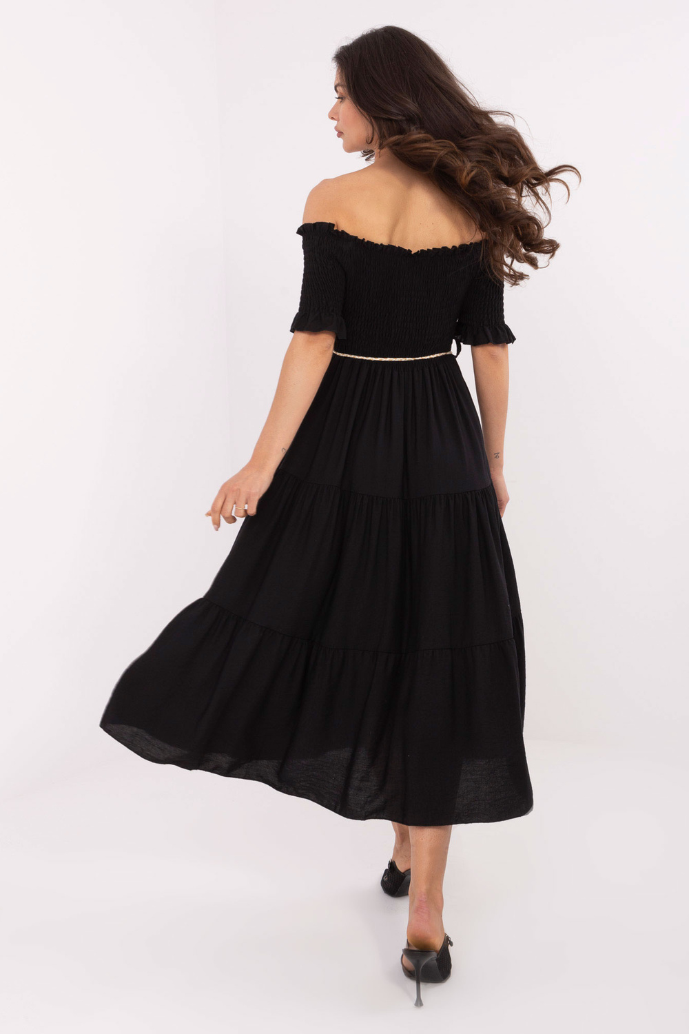 Suknelės išmatavimai vieno dydžio: plotis po pažastimis - 34 cm (ištiesta plokščiai), plotis po pažastimis - 70 cm (po tempimo), juosmens plotis - 33 cm (ištiesta plokščiai), juosmens plotis - 68 cm (po tempimo), klubų plotis - 60 cm, rankovių ilgis - 21 cm, bendras ilgis - 111 cm.