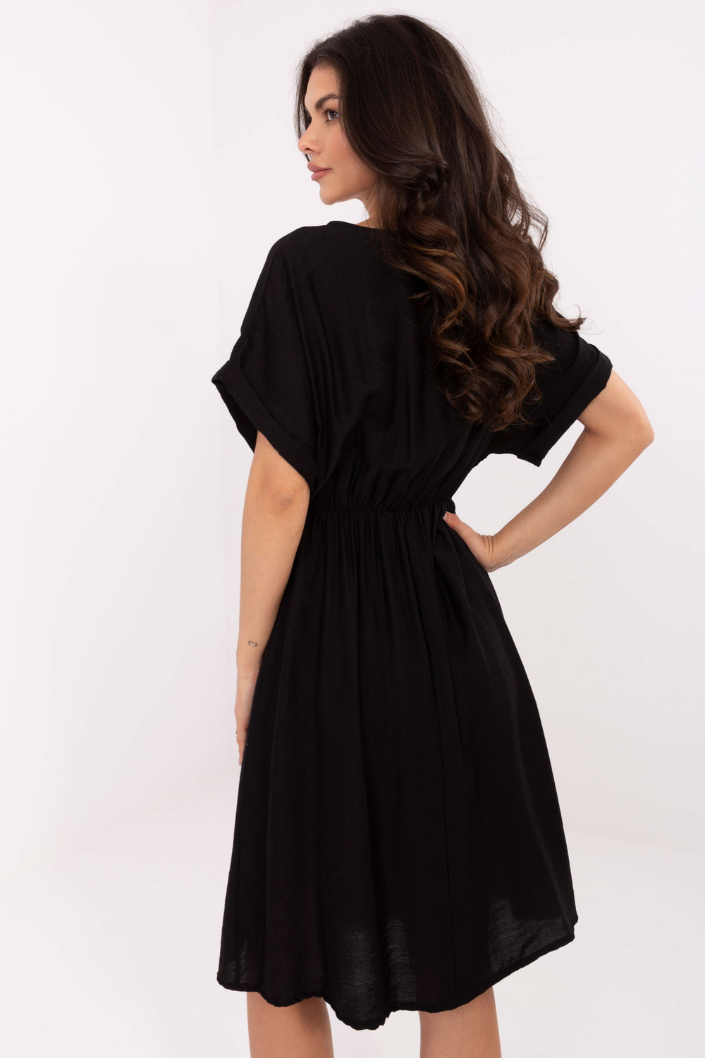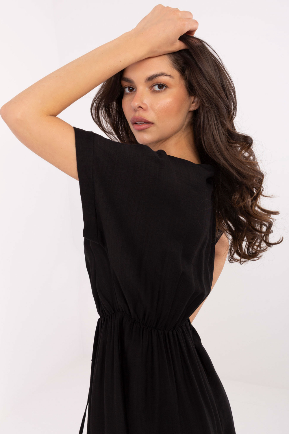 Modelis dėvi vieno dydžio drabužius. Modelio išmatavimai: ūgis 173 cm, krūtinė 89 cm, juosmuo 65 cm, klubai 91 cm.