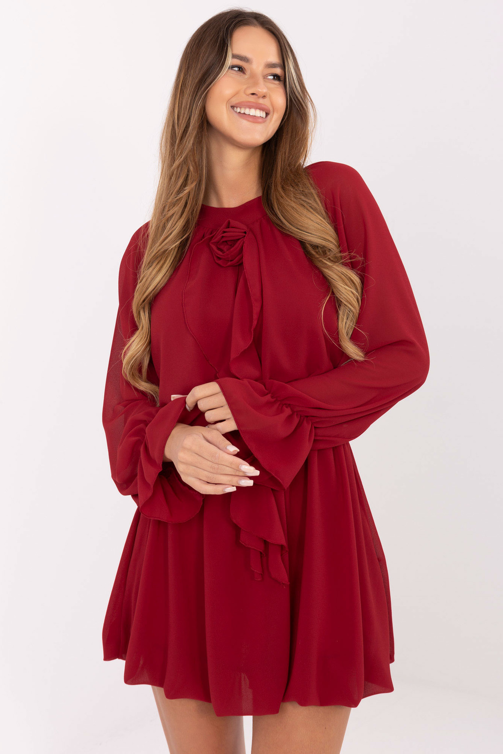 Modelis dėvi vieno dydžio rūbą. Modelio matmenys: ūgis 176 cm, krūtinė 90 cm, liemuo 62 cm, klubai 94 cm.