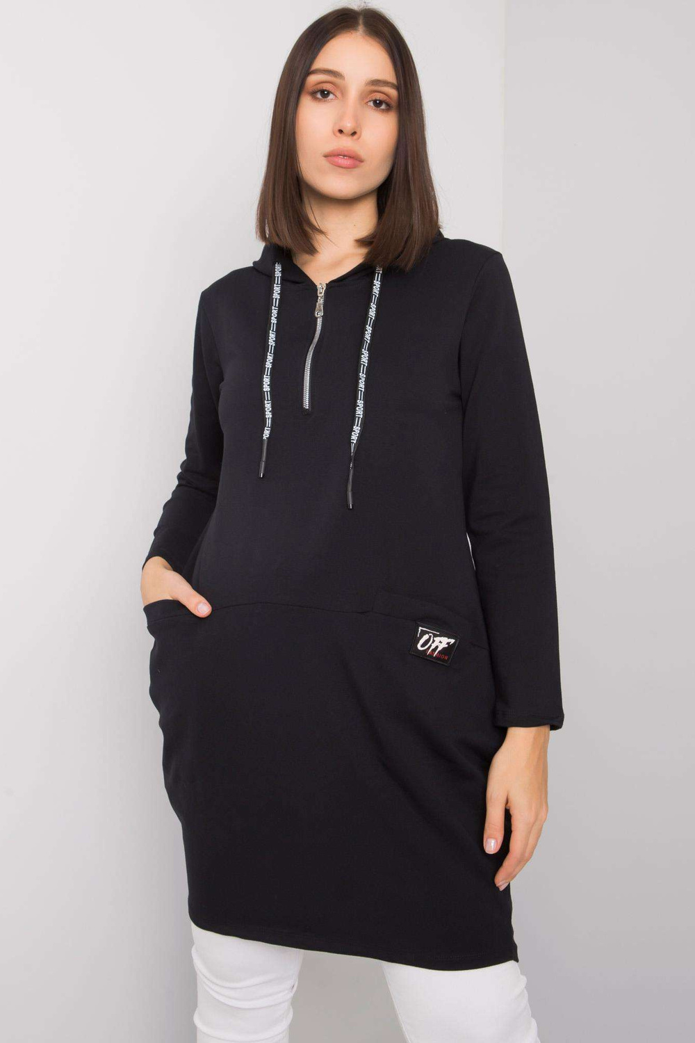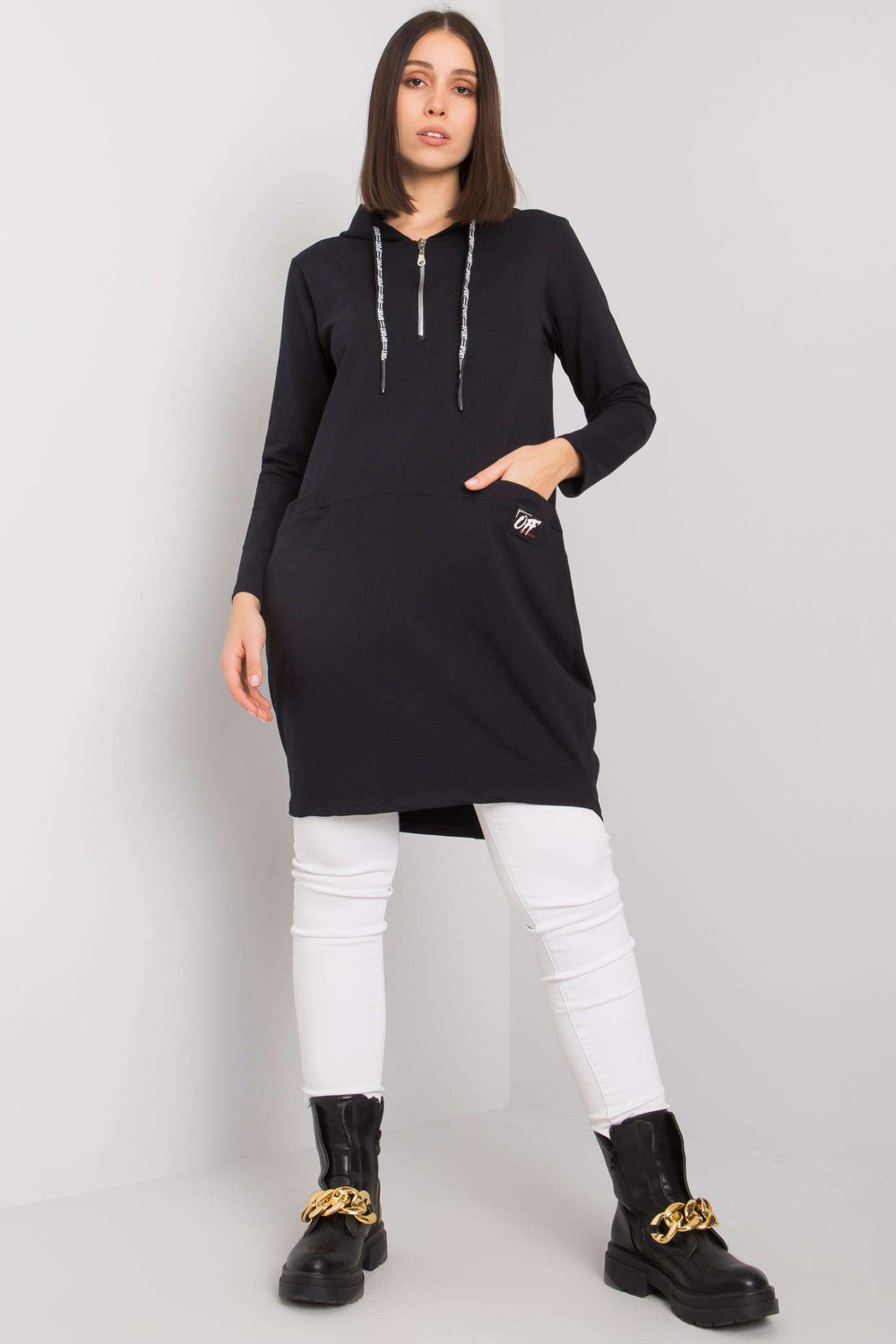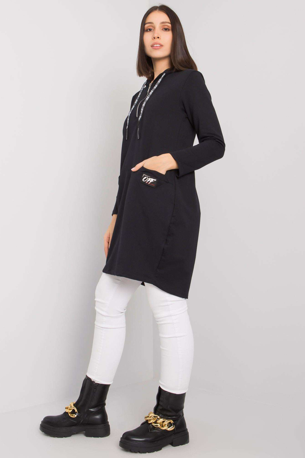 Juoda medvilninė plius dydžio tunika su „Kierra“ gobtuvu.