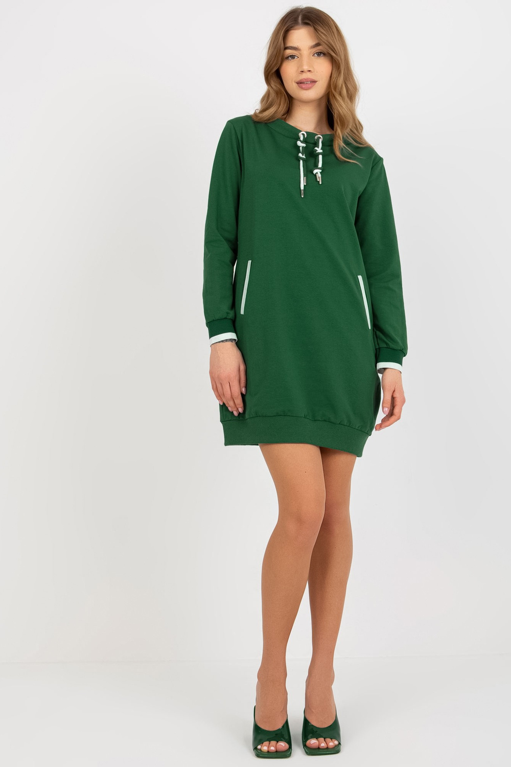 Tamsiai žalia mini megztinis suknelė su dryžiais. Prekės kodas: RV-TU-8379.46 Dominuojantis raštas: glotnus Stilius: laisvalaikis: laisvalaikis, pasivaikščioti, į miestą Modelis dėvi vieno dydžio drabužius. Modelio matmenys: aukštis 173 cm, krūtinė 78 cm, juosmuo