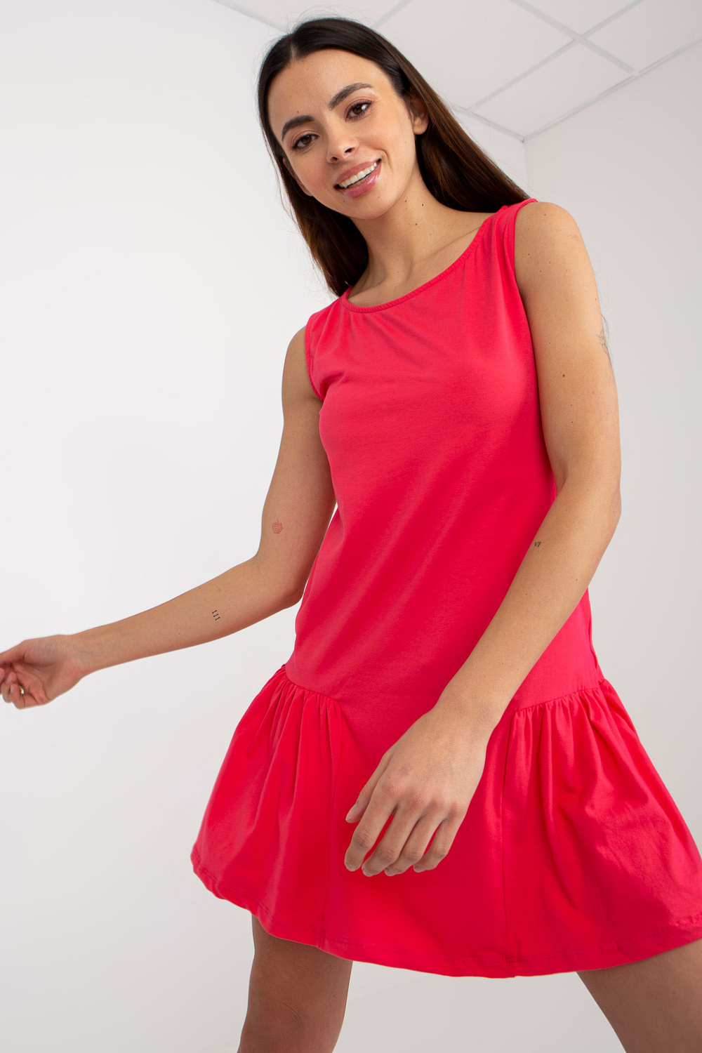 Koralinė mini suknele su raukšleliu su apvalia iškirpte. prekės kodas: EM-TU-HS-20-282.38P dominuojantis raštas: lygus Stilius: laisvalaikis: laisvalaikis, pasivaikščioti, į miestą, vasarai Modelis dėvi S dydį. Modelio matmenys: ūgis 175 cm , autobusas