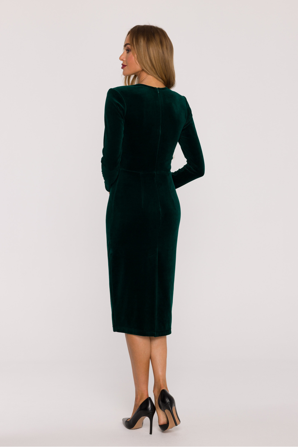 Classic and sensual velvet midi suknelė that combines elegance with timeless simplicity. Made of soft, pleasant to the touch velvet Medžiaga:, beautifully reflects the light, creating a subtle, luxurious shine. The suknelė features a deep sweetheart neckline that accentuates the feminine silhouette and adds elegance to the overall look. The long, straight sleeves bring balance to the silhouette, giving it an elegant and well-balanced character. The suknelė has a fitted pencil shape, with a clearly defined waist and a knee-length, which visually slims the silhouette and makes it perfect for both evening stylings and special occasions. The does not have pockets or lining, which maintains lightness and flexibility. The concealed zipper at the back makes it easy to put on and ensures a perfect fit. Designed and made in Poland with attention to every detail, it is the perfect choice for women who appreciate classic elegance and comfort.